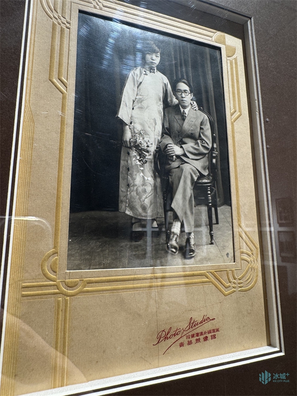 本次特展,《1920—50年代:岁月容颜》单元中,共展出宋兴文收藏的老道外人在照相馆拍摄的超百张原版照片,其中有单人照、多人合影、结婚大合影等。“本次展览宣传海报上的两个主题形象,分别来源于一、二两个单元。”宋兴文说,其中,第一单元“岁月容颜”的代表是一张老道外著名画像师朱景阳与妻子于1920年代在青华照相馆拍摄的合照,一身西装、文质彬彬的朱景阳与身着旗袍、气质温婉的妻子可谓郎才女貌,与之展出的,还有一组其家的家庭相册。