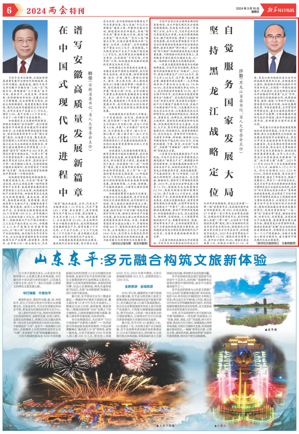 习近平总书记在全国两会期间的重要讲话,为以中国式现代化全面推进强国建设、民族复兴伟业进一步指明了方向。去年9月,习近平总书记再次亲临黑龙江考察,为我们明确战略定位、赋予使命任务,擘画了全面振兴宏伟蓝图。我们坚决贯彻落实习近平总书记重要讲话重要指示和全国两会精神,把坚定拥护“两个确立”、坚决做到“两个维护”体现到推动黑龙江高质量发展、可持续振兴的具体实践上,更好服务中国式现代化建设大局,以一地一域的振兴发展为全局增光添彩。