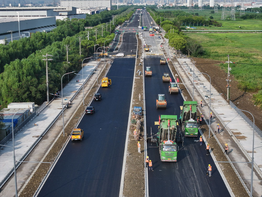 8月22日拍摄的苏州强胜路接312国道工程沥青路面摊铺施工现场(无人机照片)。新华社记者 季春鹏 摄