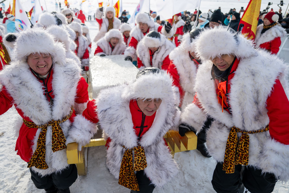 天寒地冻,白茫茫的冰面上寒气弥漫。采冰仪式上,震天鼓、出征酒、系红绸,以此祈福新的一年吉祥安顺,并为即将出征的冰雪健儿送上祝愿。“太热闹了,从没见过这么有意思的北方民俗。”来自安徽的00后游客邱梦琪满眼新奇,一直举着手机拍照录像。