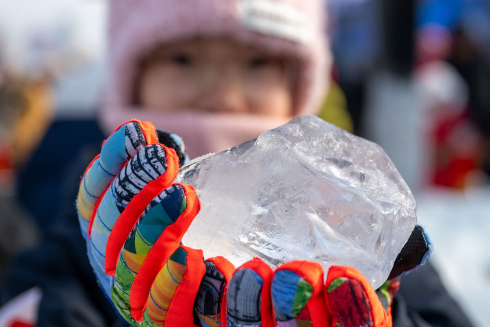 12月7日,在第五届哈尔滨采冰节现场,一名小朋友展示冰块。新华社记者 张涛 摄