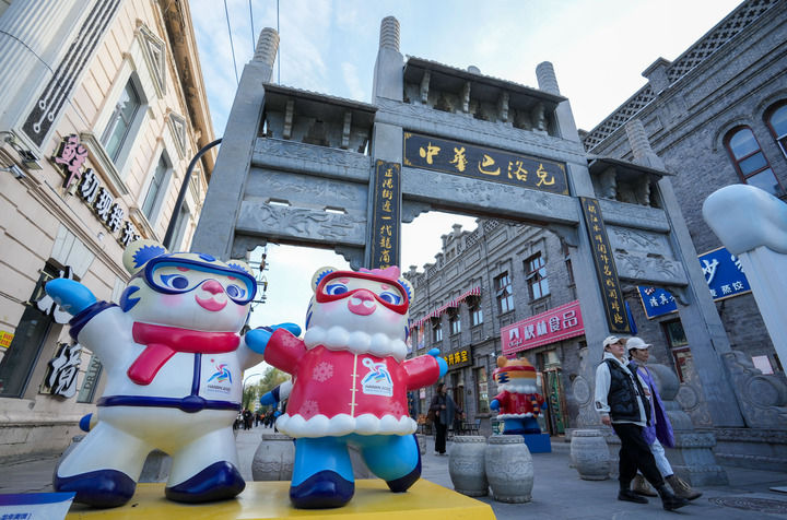 10月29日,哈尔滨中华巴洛克历史文化街区里的亚冬会吉祥物雕塑。(王建威 摄)