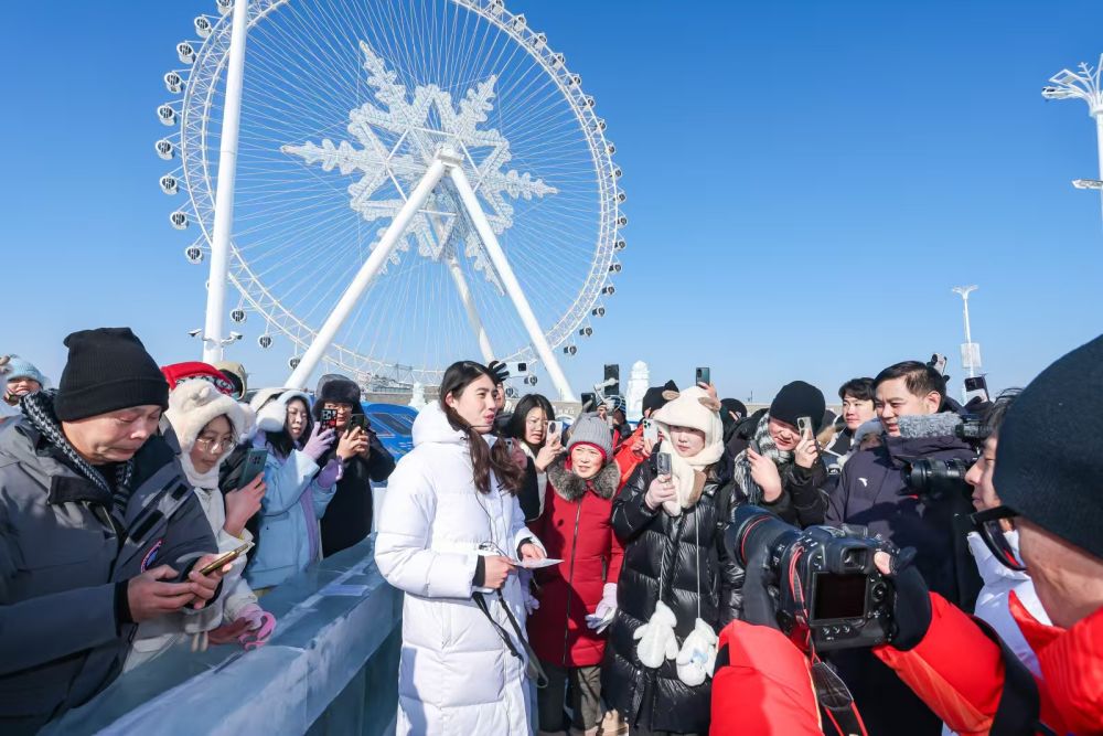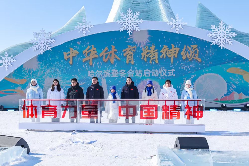 “中华体育精神颂·哈尔滨亚冬会站”10日在哈尔滨冰雪大世界启动,游泳奥运冠军张雨霏和花样滑冰冬奥冠军韩聪化身讲解员,在冰天雪地中传递中华体育精神。