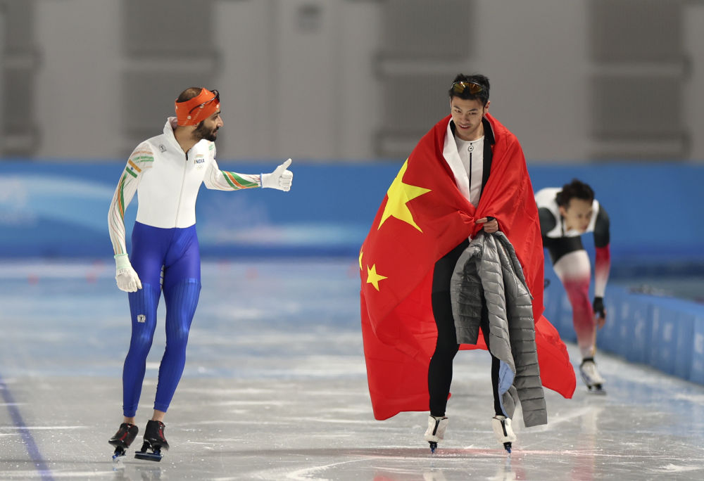 2月11日,宁忠岩(中)赛后接受印度选手祝贺。当日,第九届亚冬会速度滑冰男子1000米决赛在哈尔滨举行,宁忠岩夺得冠军。新华社记者 王楷焱 摄