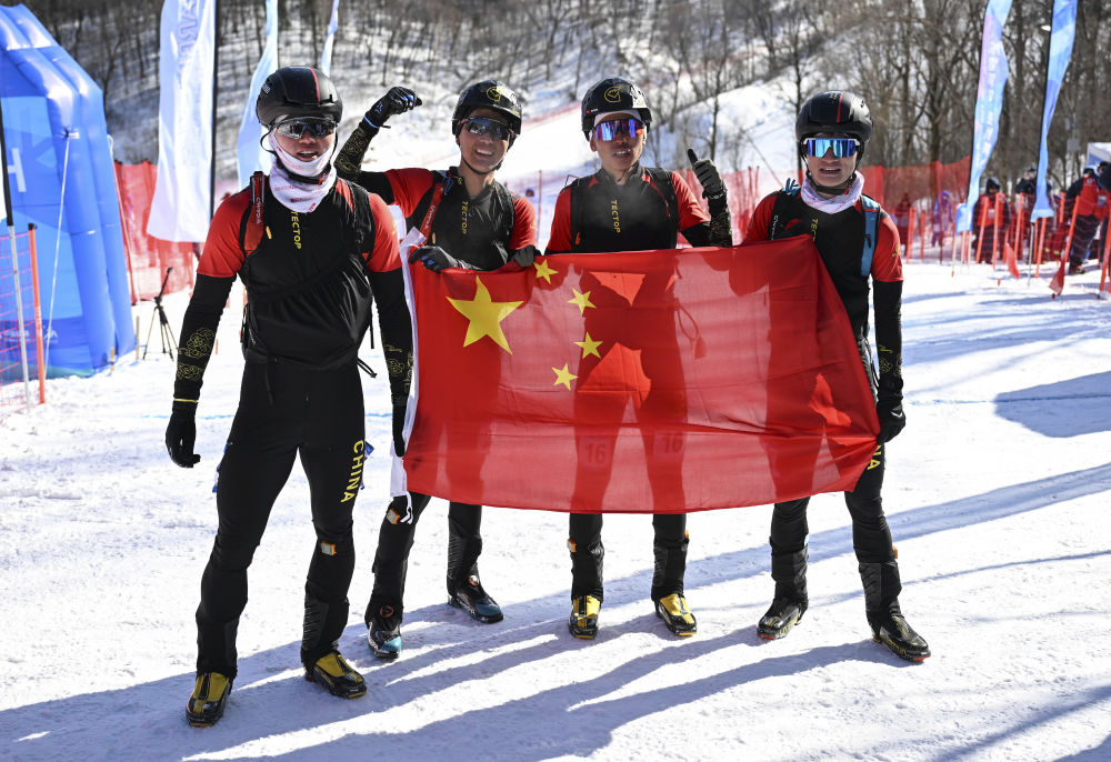 2月9日,第九届亚冬会滑雪登山男子短距离决赛在亚布力举行。图为包揽前四名的中国队选手在决赛后合影。新华社记者 谢剑飞 摄
