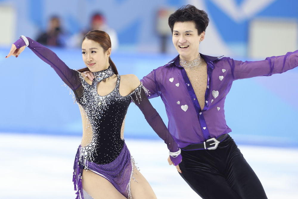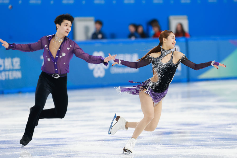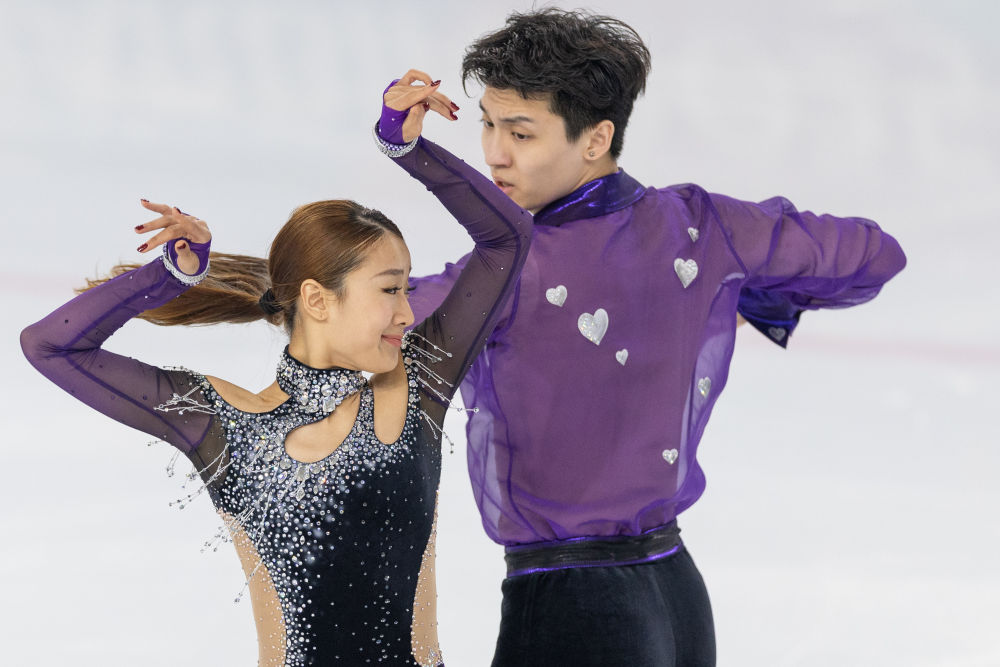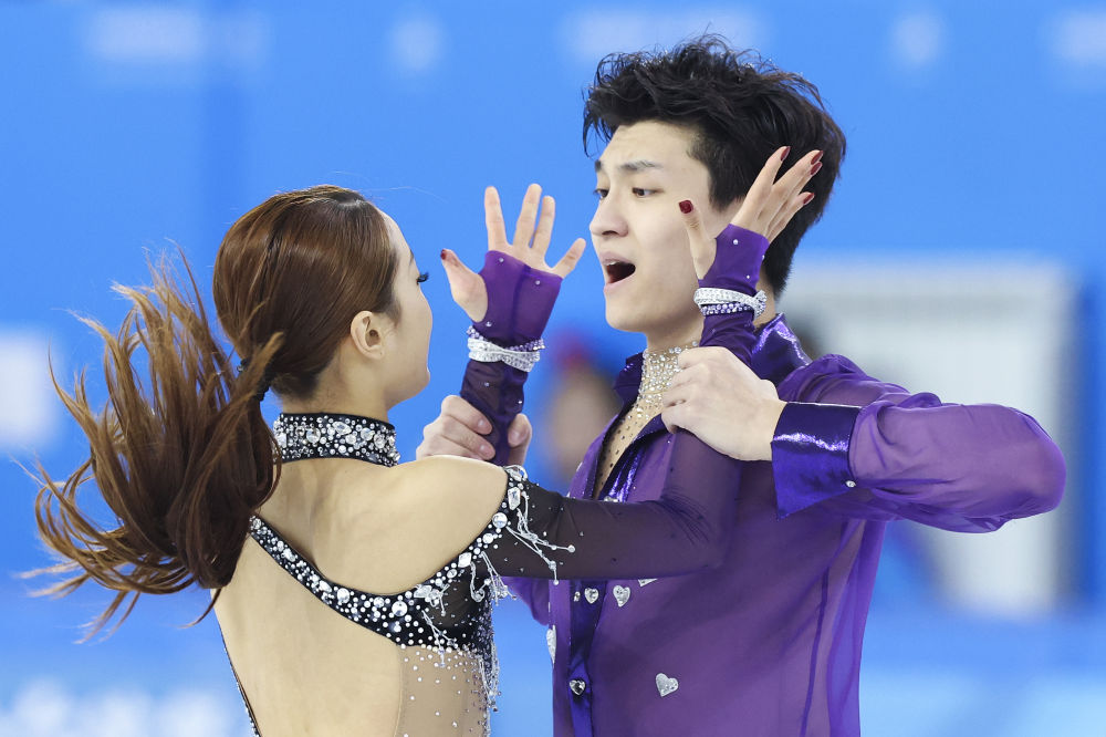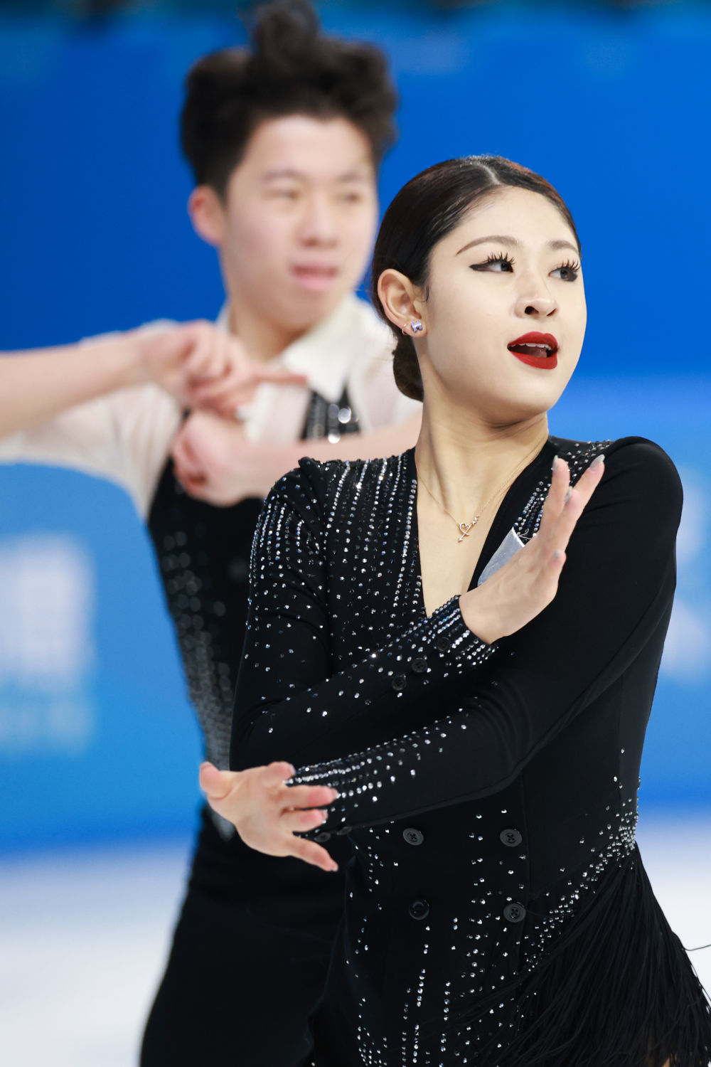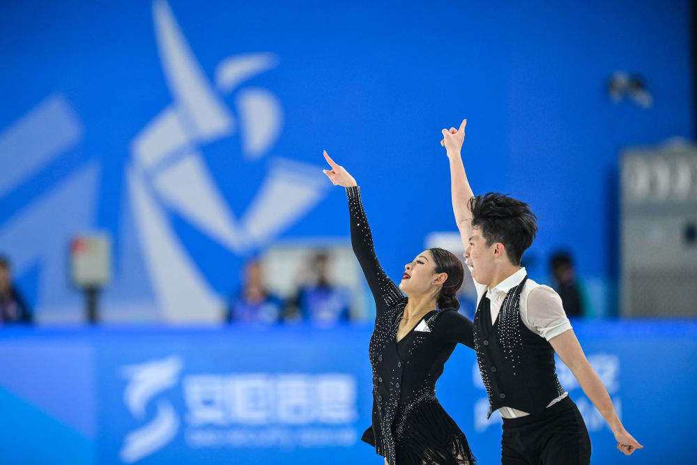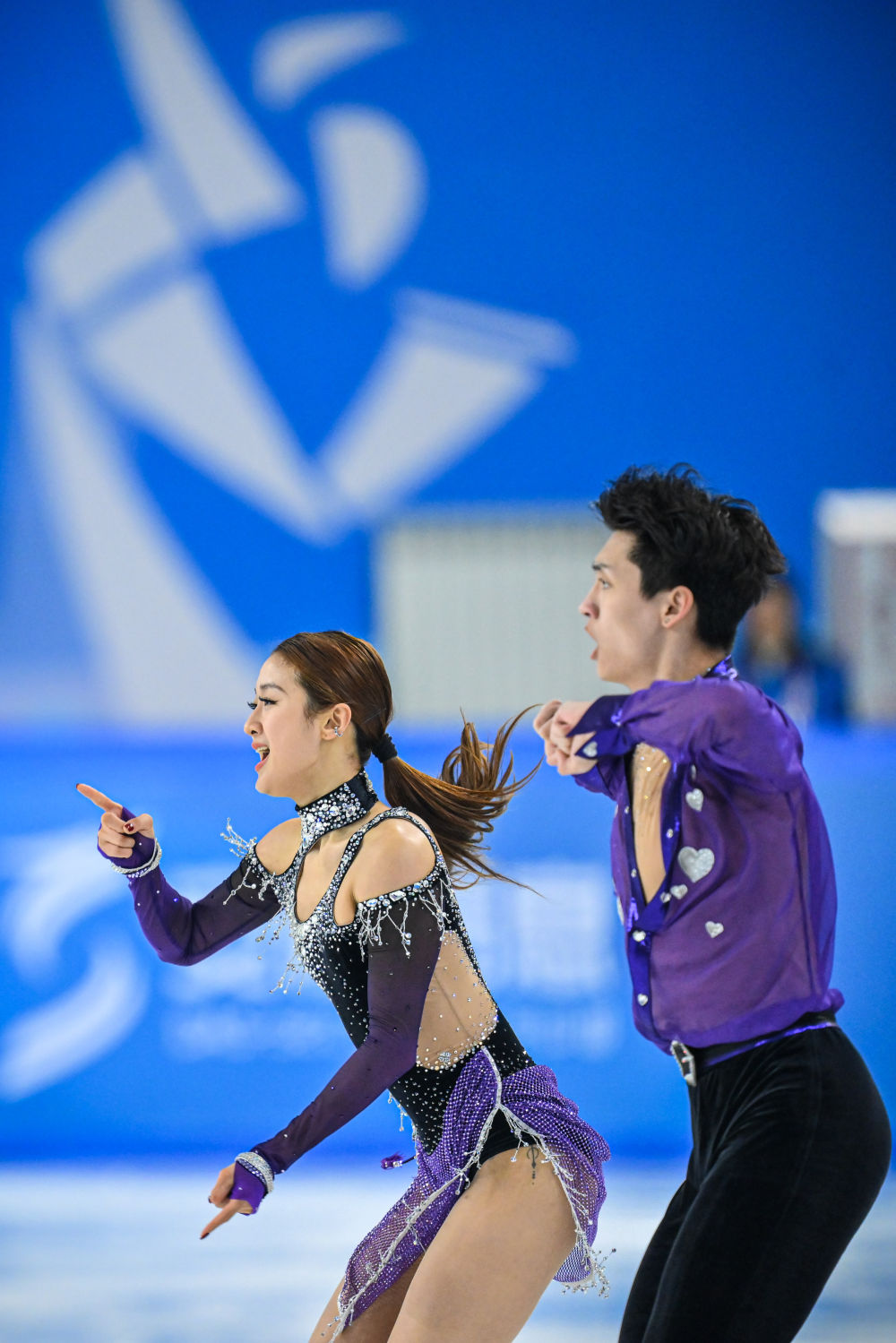 ↑中国组合肖紫兮(右)/何凌昊在比赛中。最终,他们以62.64分的成绩暂列第四。