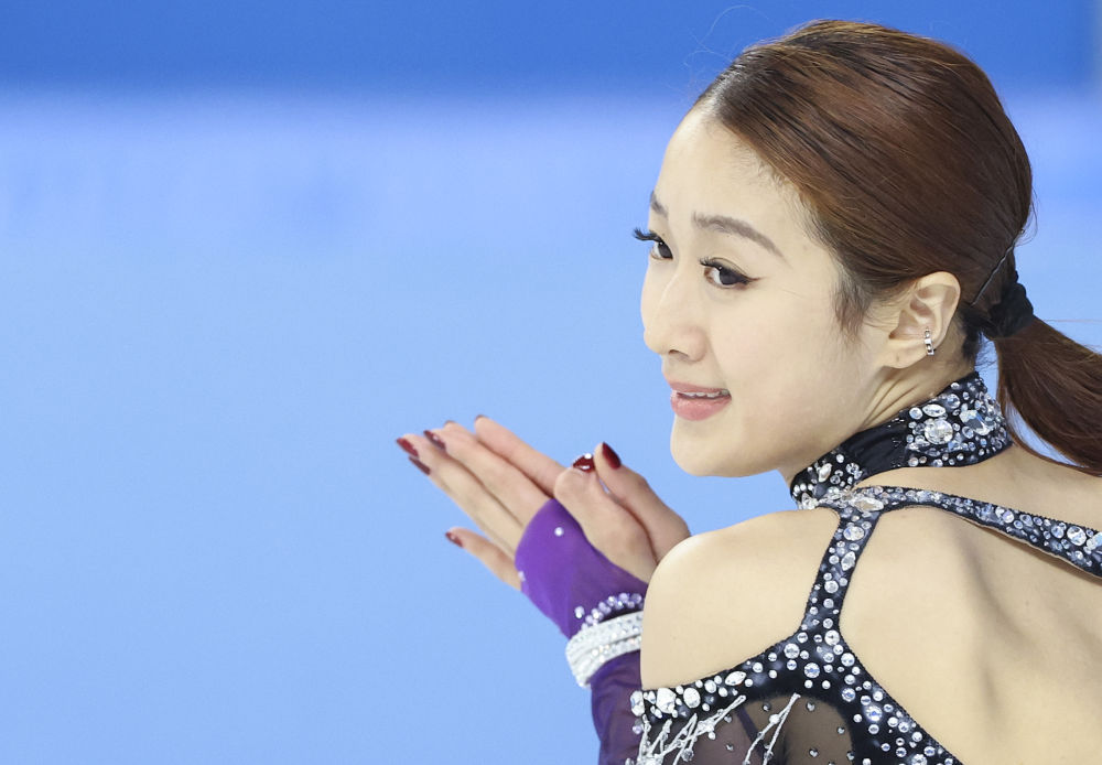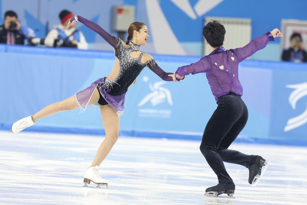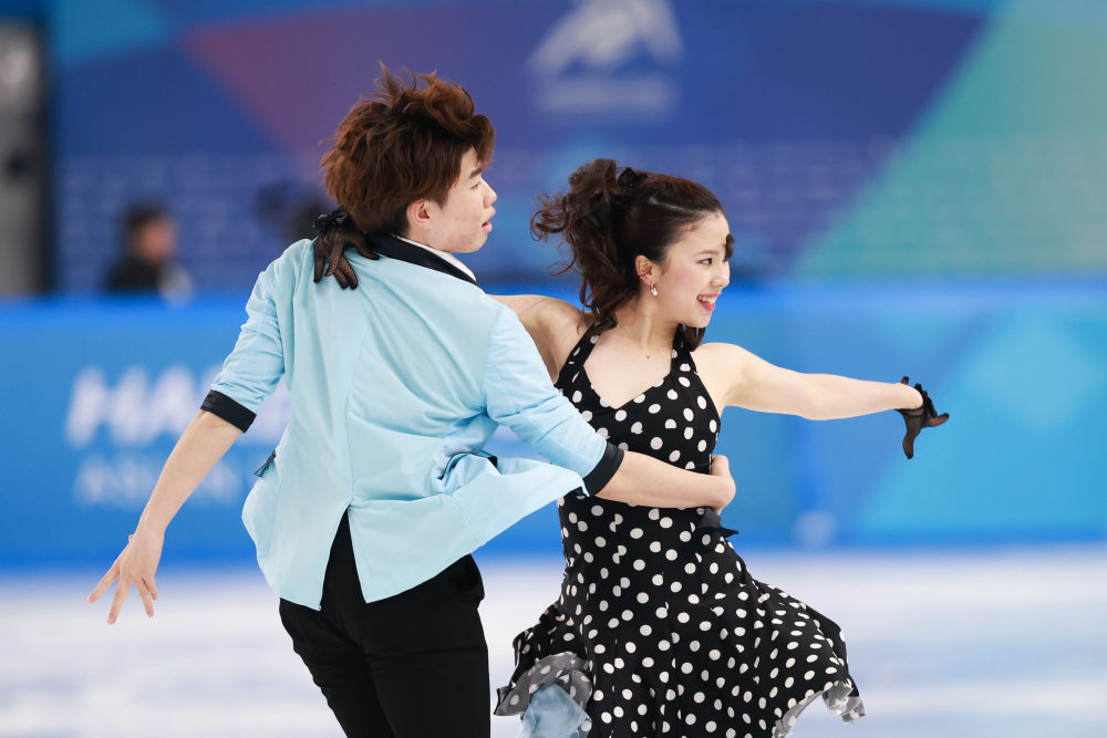 ↑日本组合吉田呗菜(右)/森田真沙也在比赛中。最终,他们以68.88分的成绩暂列第一。