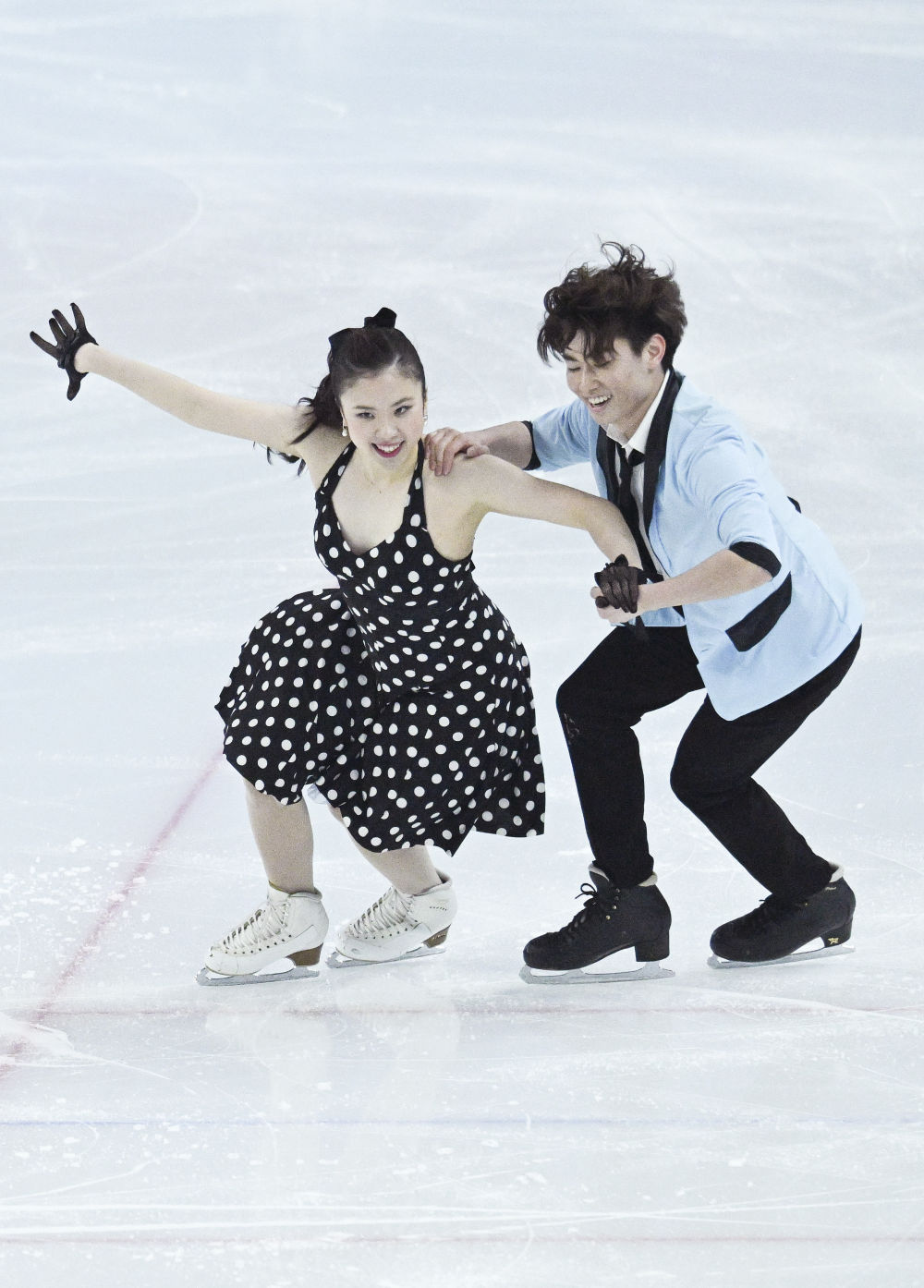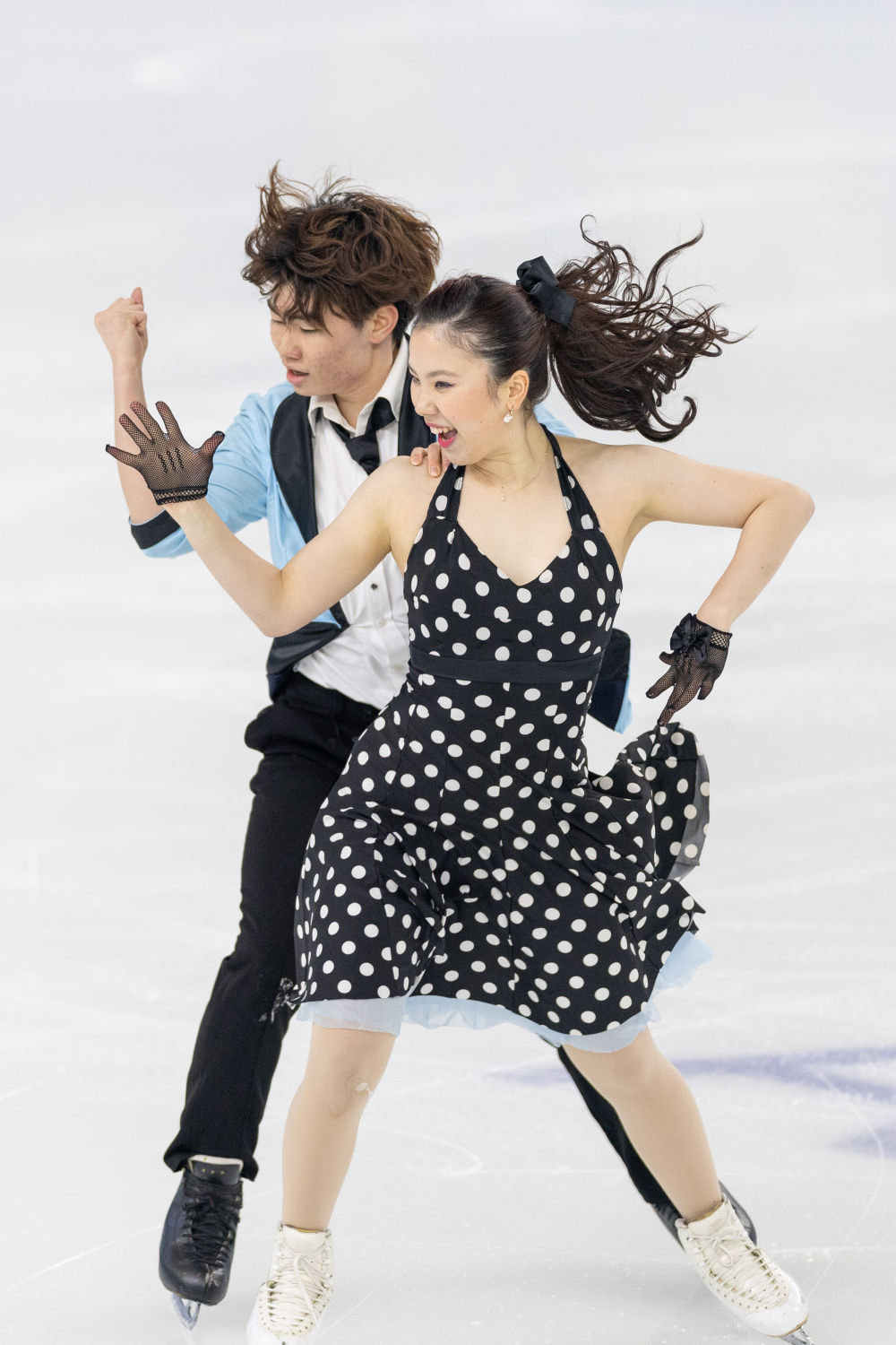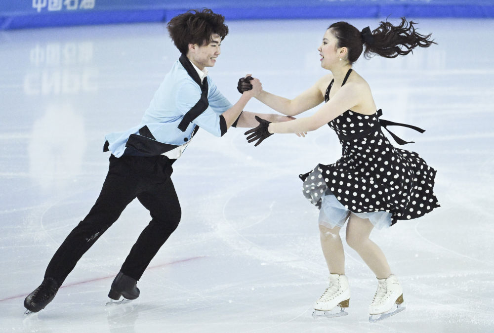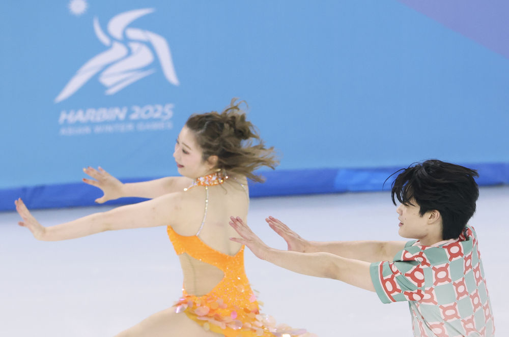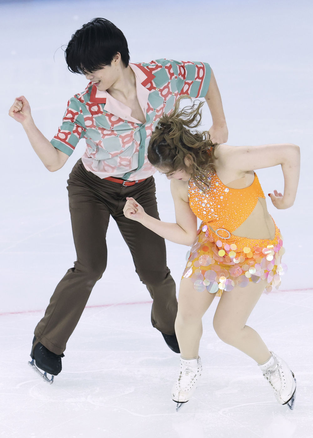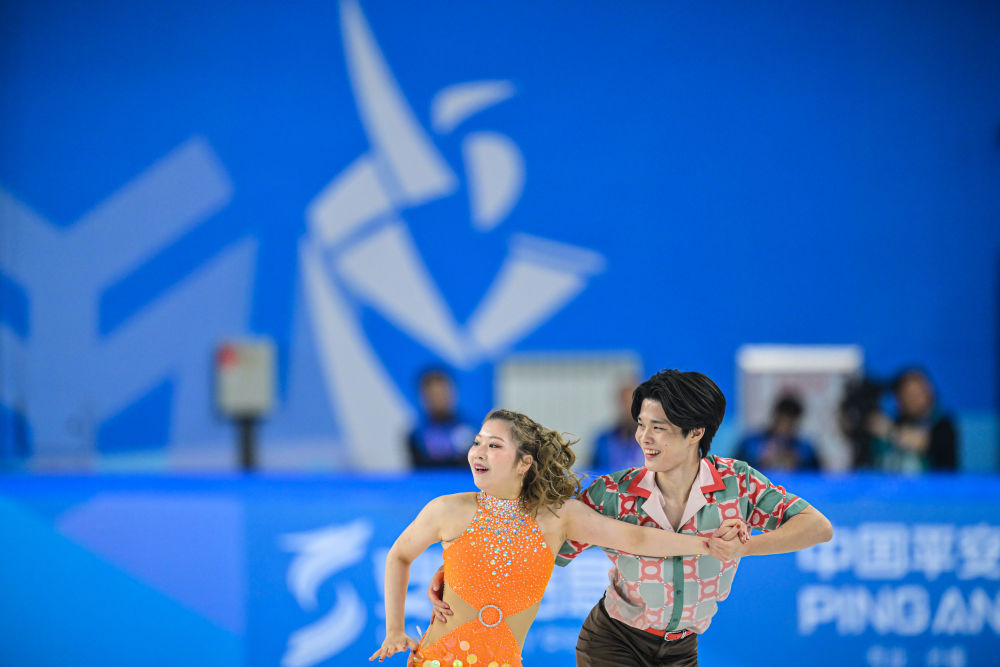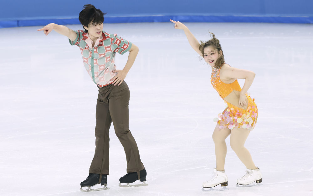 ↑日本组合吉田呗菜(前)/森田真沙也在比赛中。最终,他们以68.88分的成绩暂列第一。