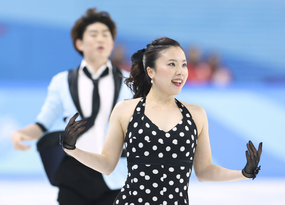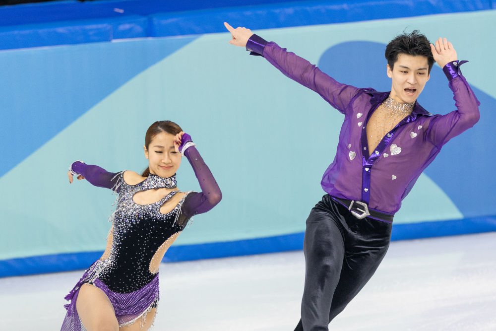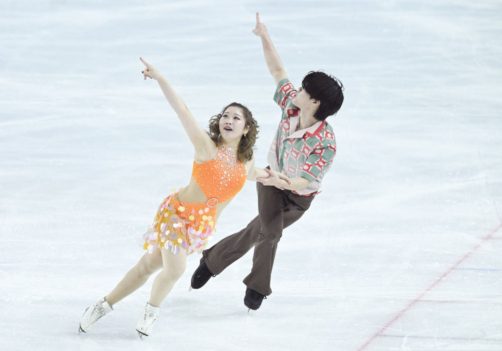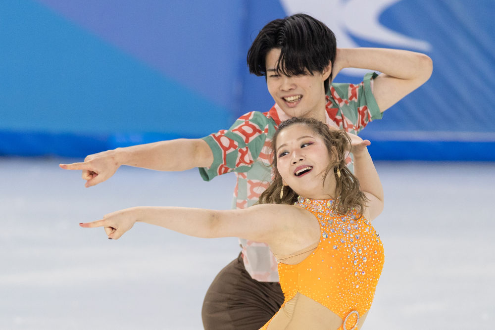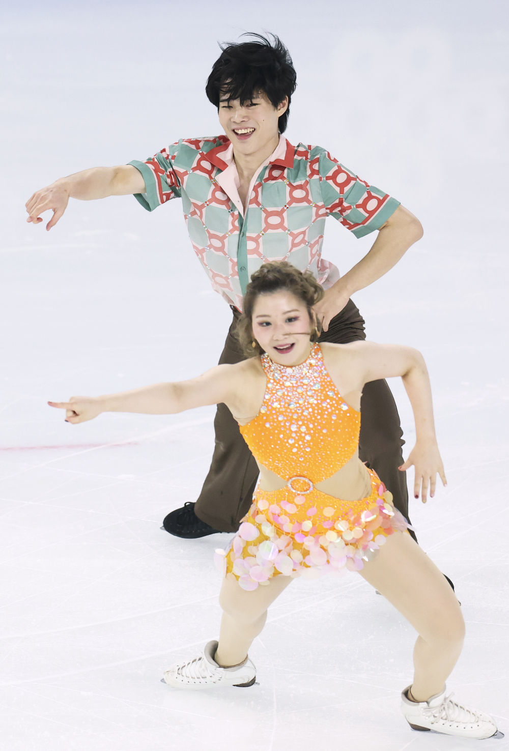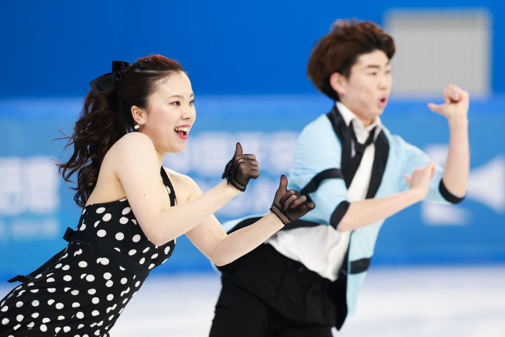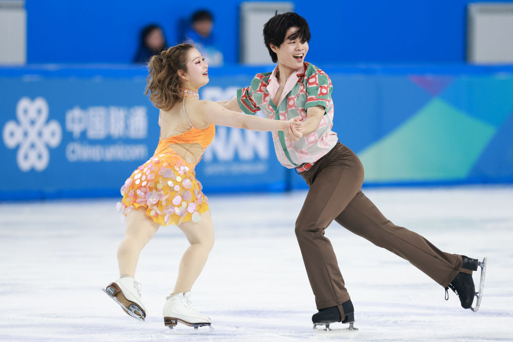 ↑日本组合吉田呗菜(前)/森田真沙也在比赛中。最终,他们以68.88分的成绩暂列第一。