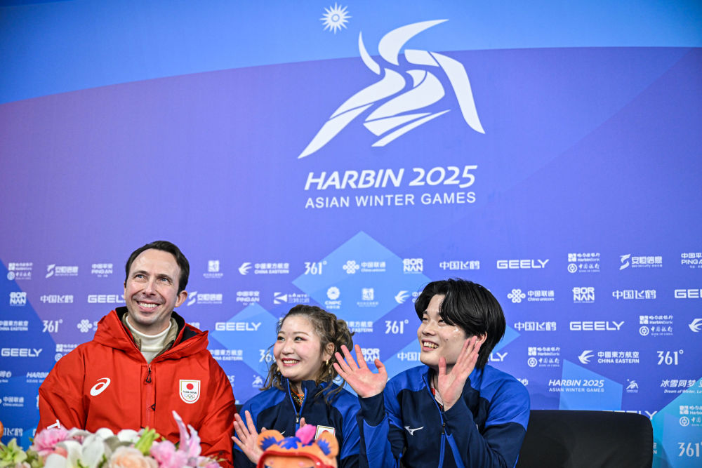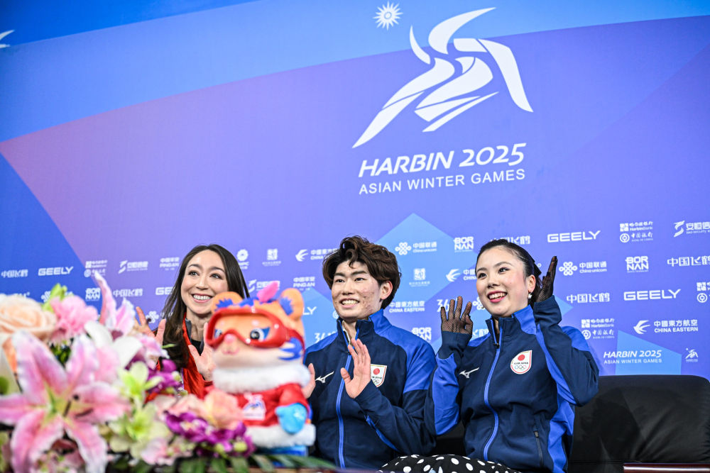 ↑日本组合吉田呗菜(右)/森田真沙也(中)在赛后等待成绩时向现场观众致意。最终,他们以68.88分的成绩暂列第一。