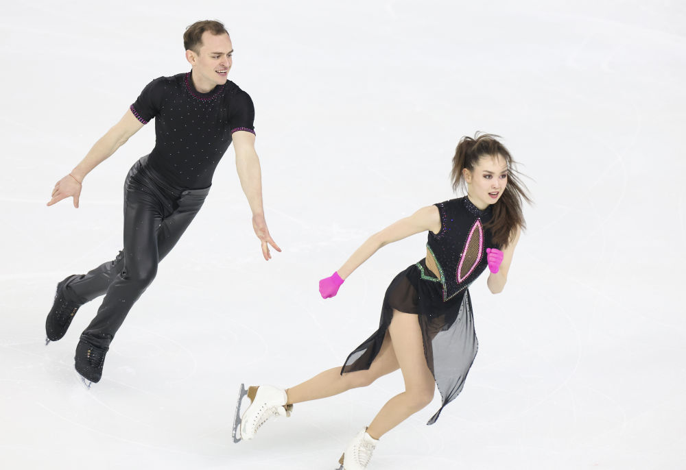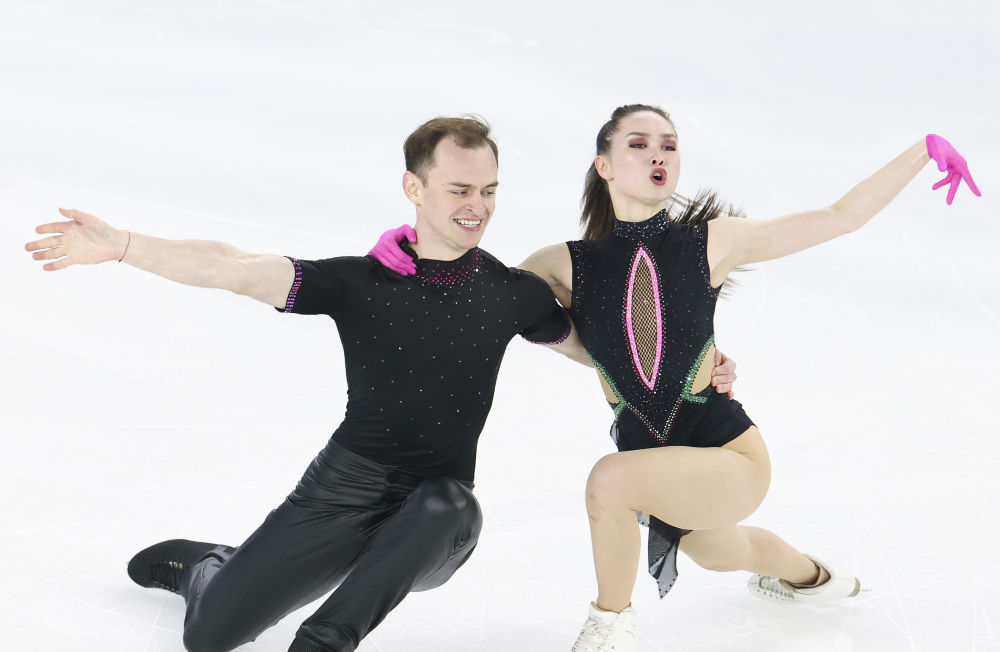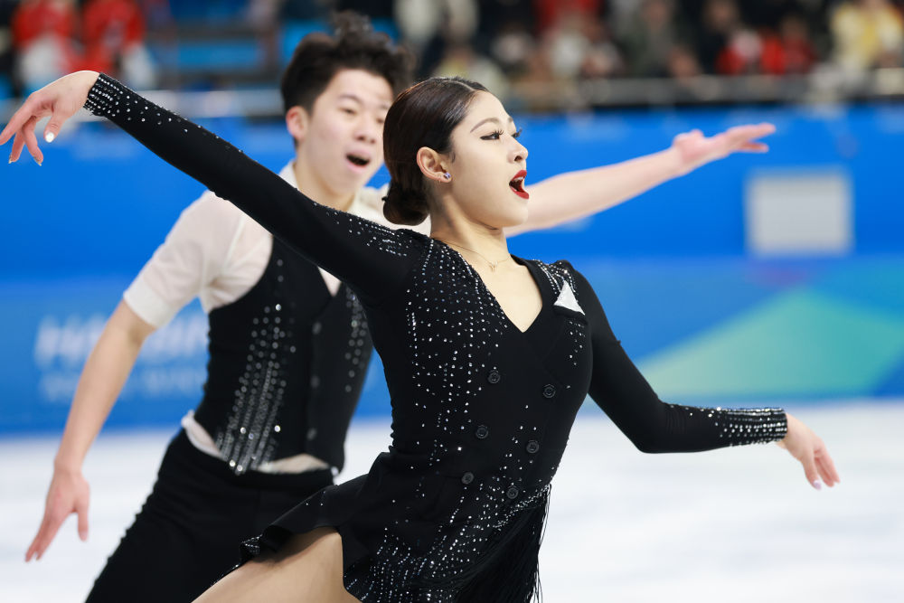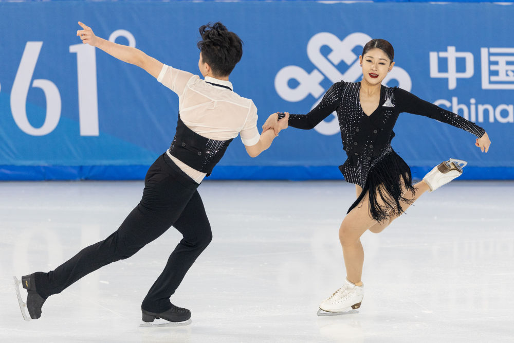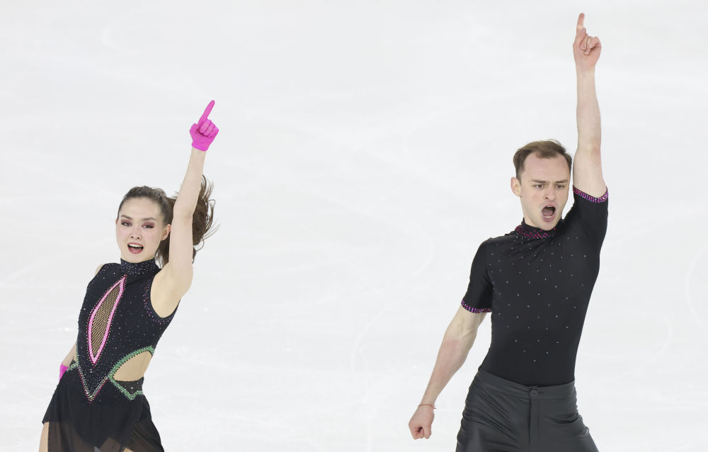 ↑哈萨克斯坦组合古卡·诺列佐娃(左)/博伊桑古尔·达特耶夫在比赛中。最终,他们以55.02分的成绩暂列第五。
