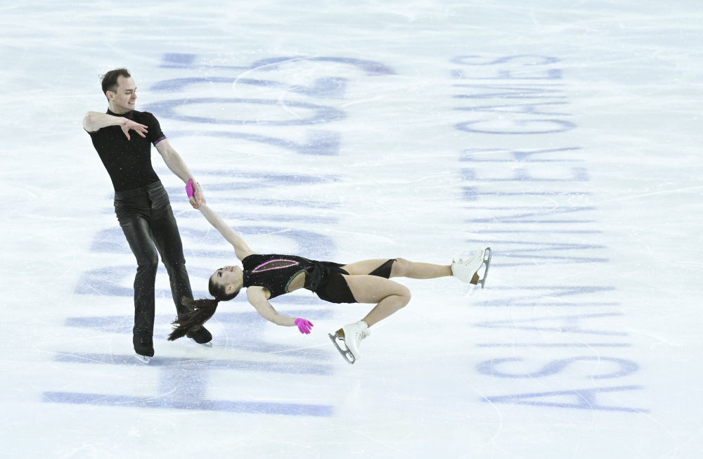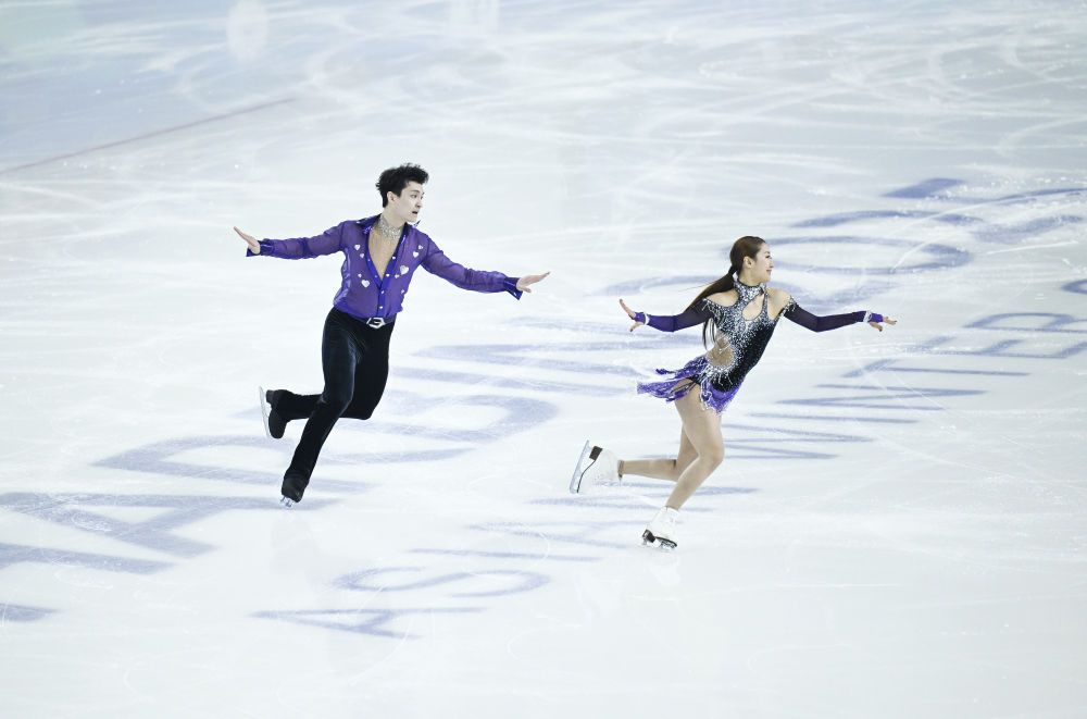 ↑哈萨克斯坦组合古卡·诺列佐娃(右)/博伊桑古尔·达特耶夫在比赛中。最终,他们以55.02分的成绩暂列第五。
