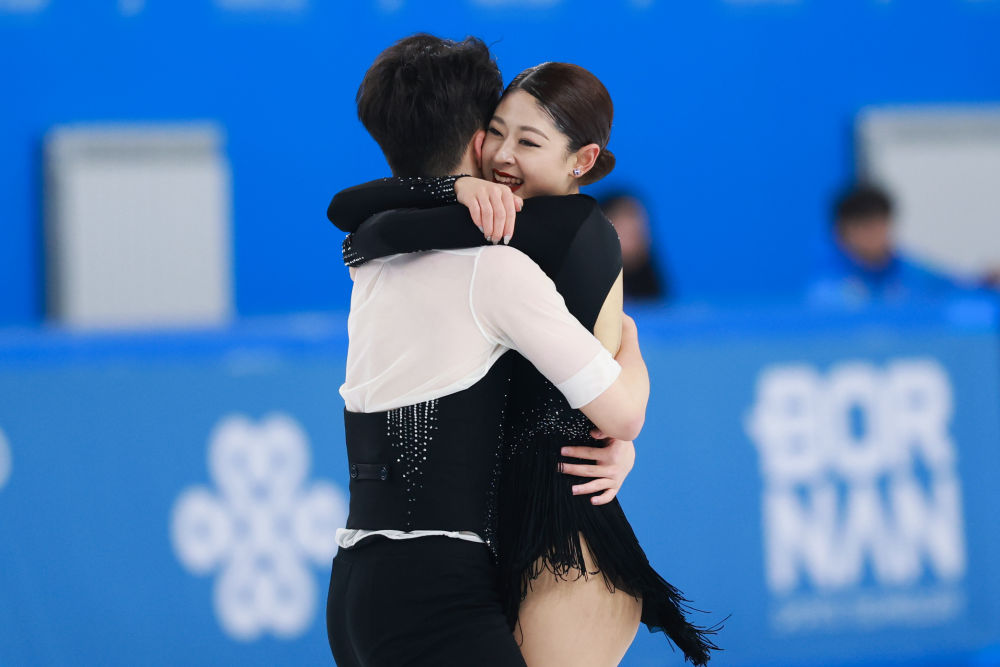 ↑中国组合肖紫兮(右)/何凌昊在比赛后拥抱。最终,他们以62.64分的成绩暂列第四。