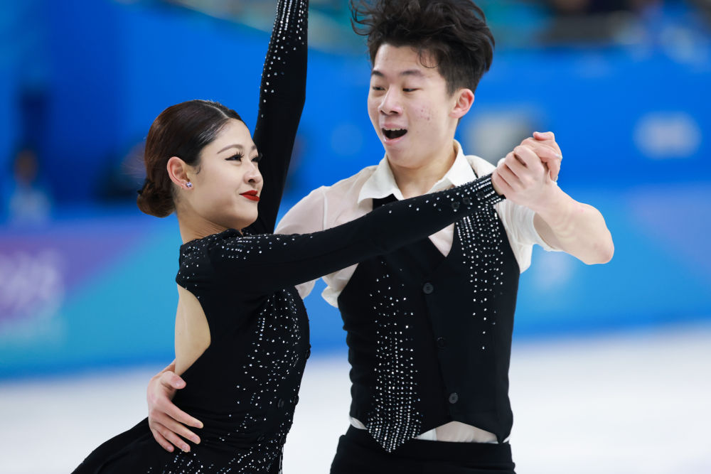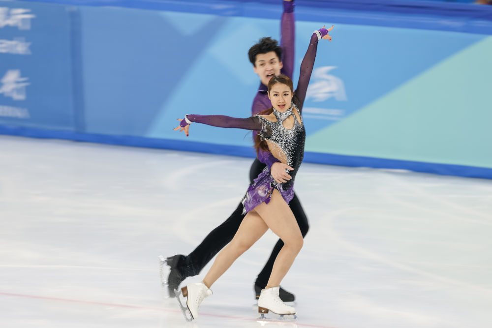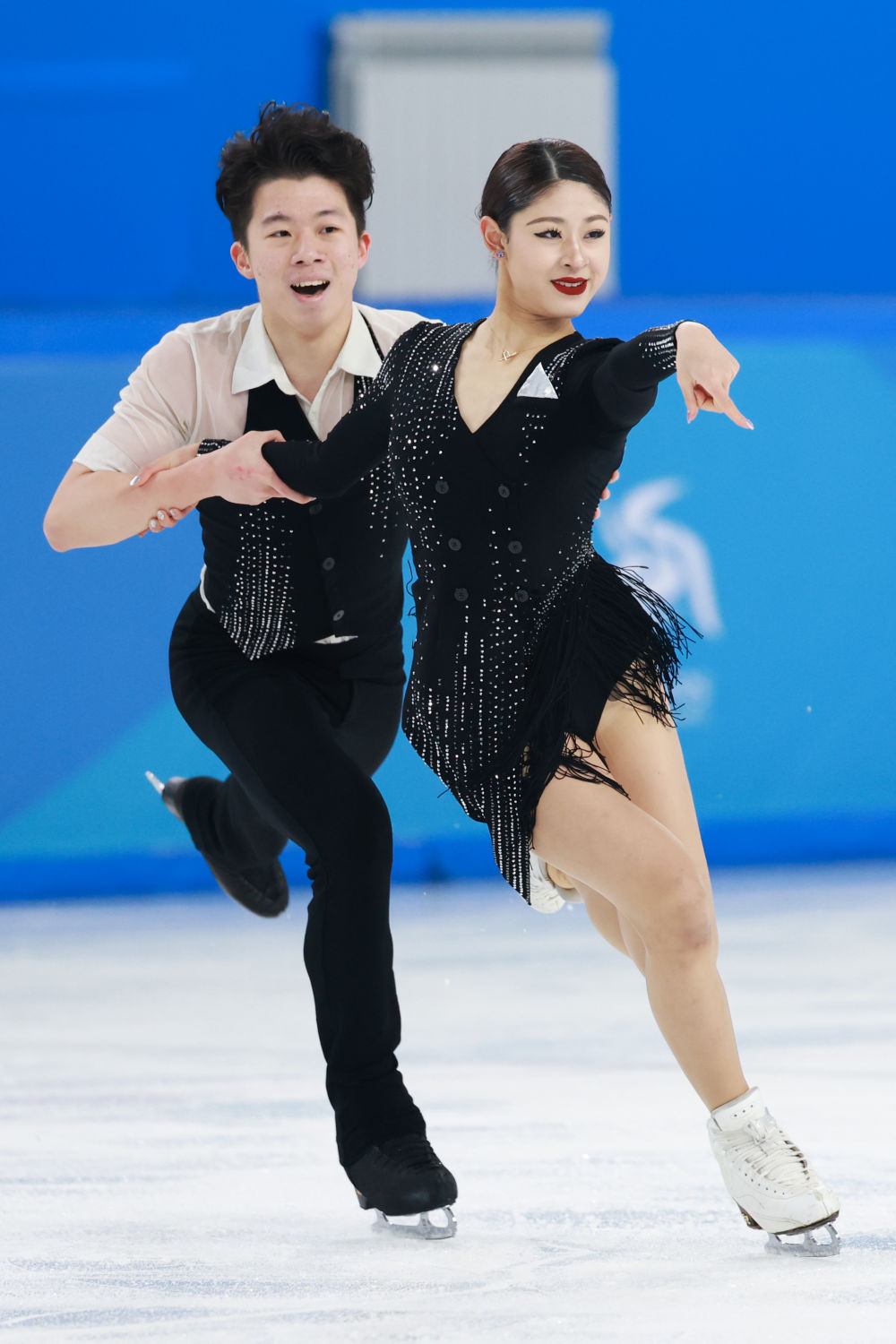 ↑中国组合肖紫兮(左)/何凌昊在比赛中。最终,他们以62.64分的成绩暂列第四。