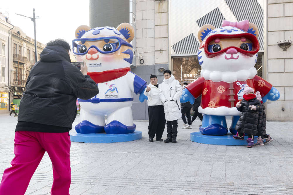 1月8日,在哈尔滨中央大街,游客在亚冬会吉祥物景观处留影。新华社记者 谢剑飞 摄