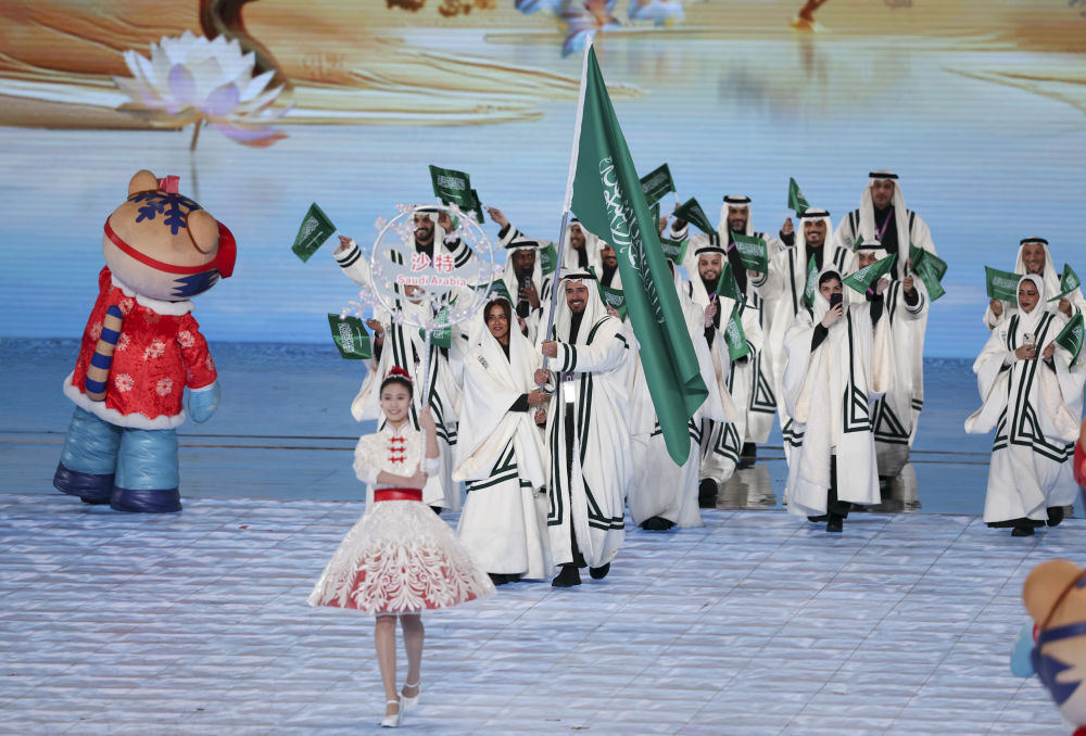 2月7日,沙特阿拉伯体育代表团在开幕式上入场。新华社记者 杨磊 摄
