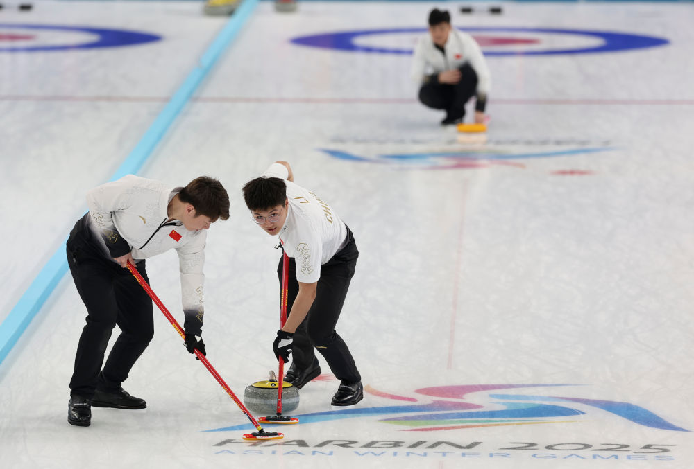 2月12日,中国队选手王智宇(左)和李智超(中)在比赛中擦冰。新华社记者 胡星宇 摄