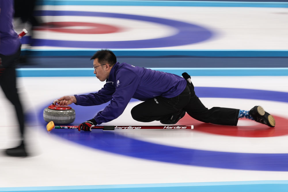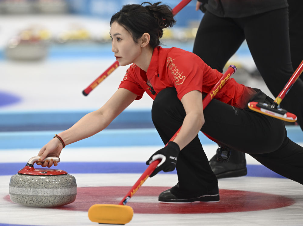 2月14日,中国队选手姜嘉怡在比赛中掷壶。新华社记者 李嘉南 摄