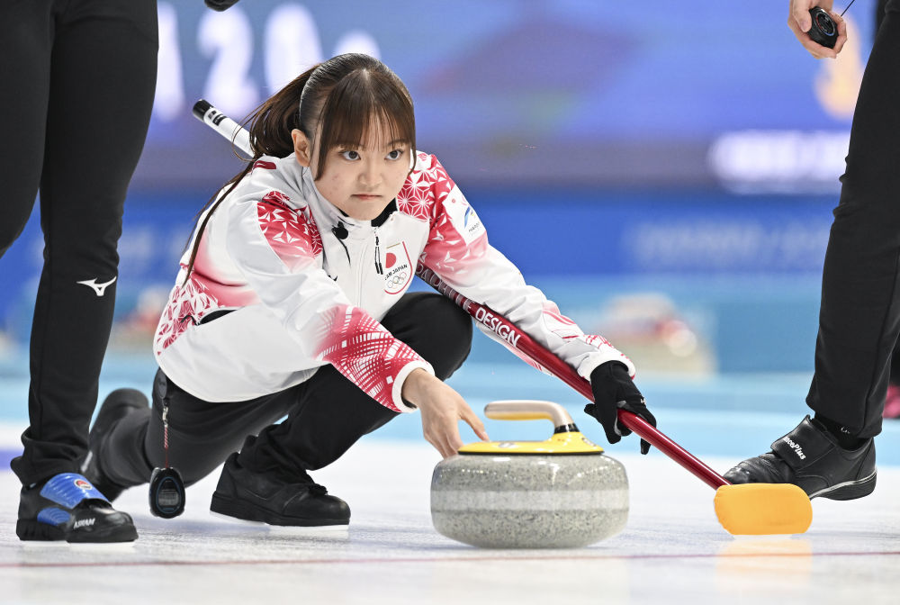 2月14日,日本队选手松永爱唯在比赛中掷壶。新华社记者 赵子硕 摄