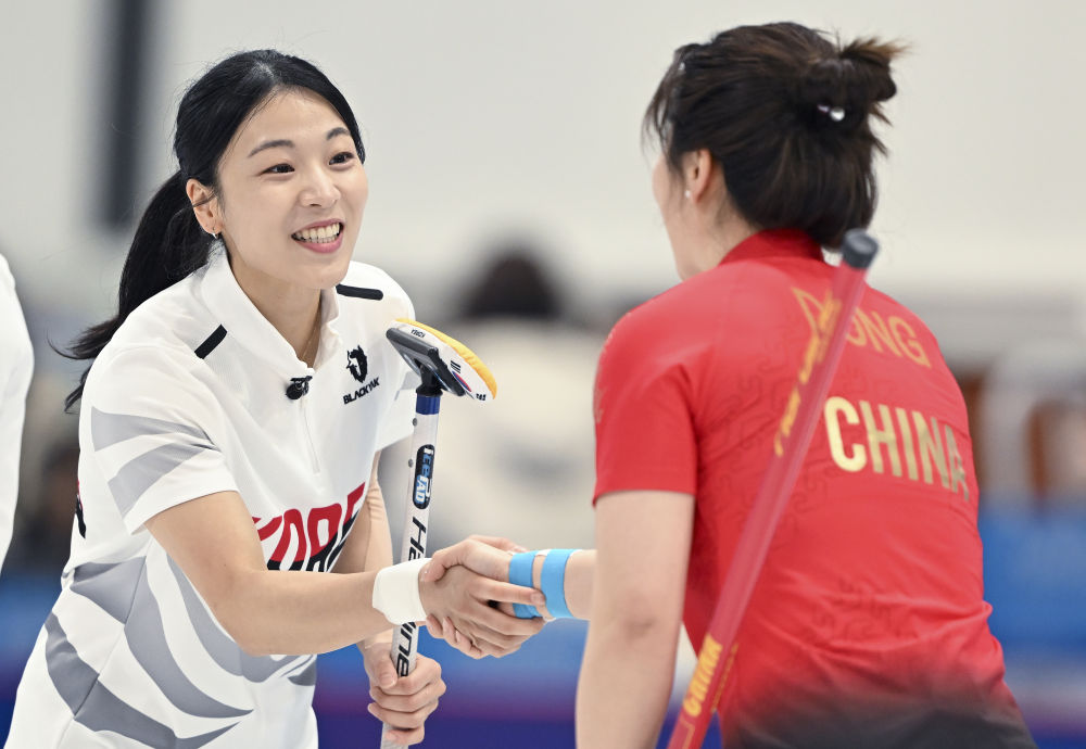 2月14日,韩国队选手金素姬(左)和中国队选手董子齐在赛后握手致意。新华社记者 赵子硕 摄