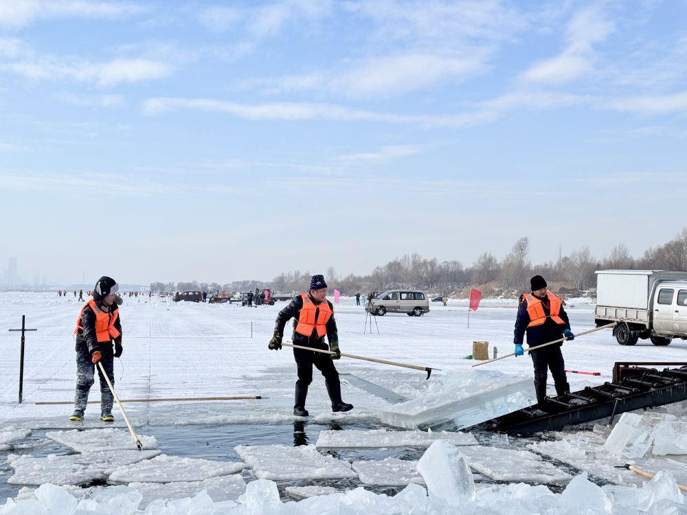 工人们在松花江面上采冰。新华社记者 刘赫垚 摄
