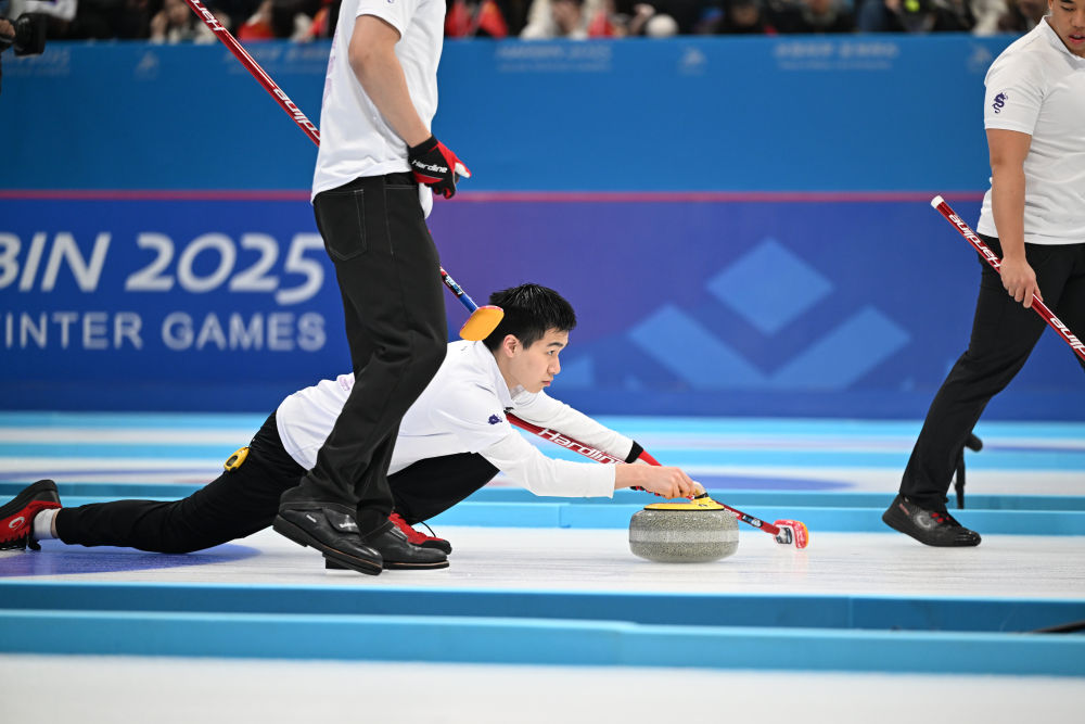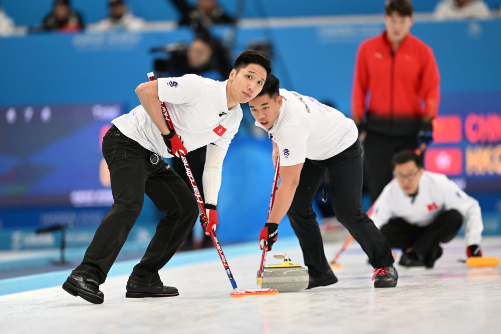 2月14日,中国香港队选手钟卓熙在比赛中掷壶。新华社记者 赵子硕 摄