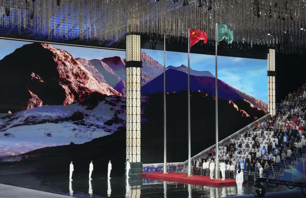 2月14日,中华人民共和国国旗和沙特阿拉伯国旗在闭幕式现场升起。当日,第九届亚洲冬季运动会闭幕式在哈尔滨举行。新华社记者王建威摄