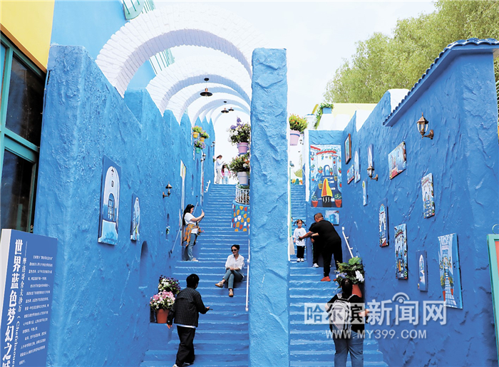 蓝墙白顶蓝台阶,沿着狭窄的巷弄拾阶而上,观赏墙上别致的鲜花与挂画,感受浓郁的地中海风情。4日,松北区太阳岛地铁站1号出口附近,被布置成了旅游胜地摩洛哥舍夫沙万的模样,引得众多市民游客前来拍照,成为童话般梦幻的打卡地。