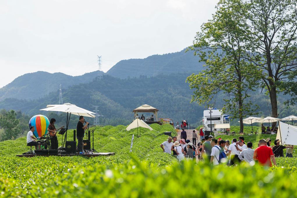 5月2日,游客在乾潭镇胥江村的千亩茶园内欣赏演出。五一小长假期间,浙江省建德市乾潭镇胥江村在千亩茶园内推出农文旅假日消费场景,露天舞台演出、露营烧烤、茶园咖啡、采茶体验等丰富的活动吸引游客前来享受乡村“茶旅融合”的假日生活。 新华社记者 徐昱 摄