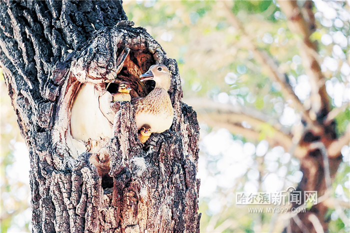 据了解,今年北归的成年鸳鸯自5月下旬进入繁殖期后,陆续就有小鸳鸯出生,六七月份是鸳鸯孵化的高峰期,今年更是突破了历史最高纪录。这得益于常年来鸳鸯保护志愿者们的不断付出,还有公园管理方和市民的爱护。“还有一点,今年新增设的人工鸟巢和监控设备也起到了关键作用,通过科学有效的监护,能够及时掌握野生鸳鸯的孵化情况,保障它们栖息环境的安全。”车春虎说,今年肯定是鸳鸯出生率最高的一年。