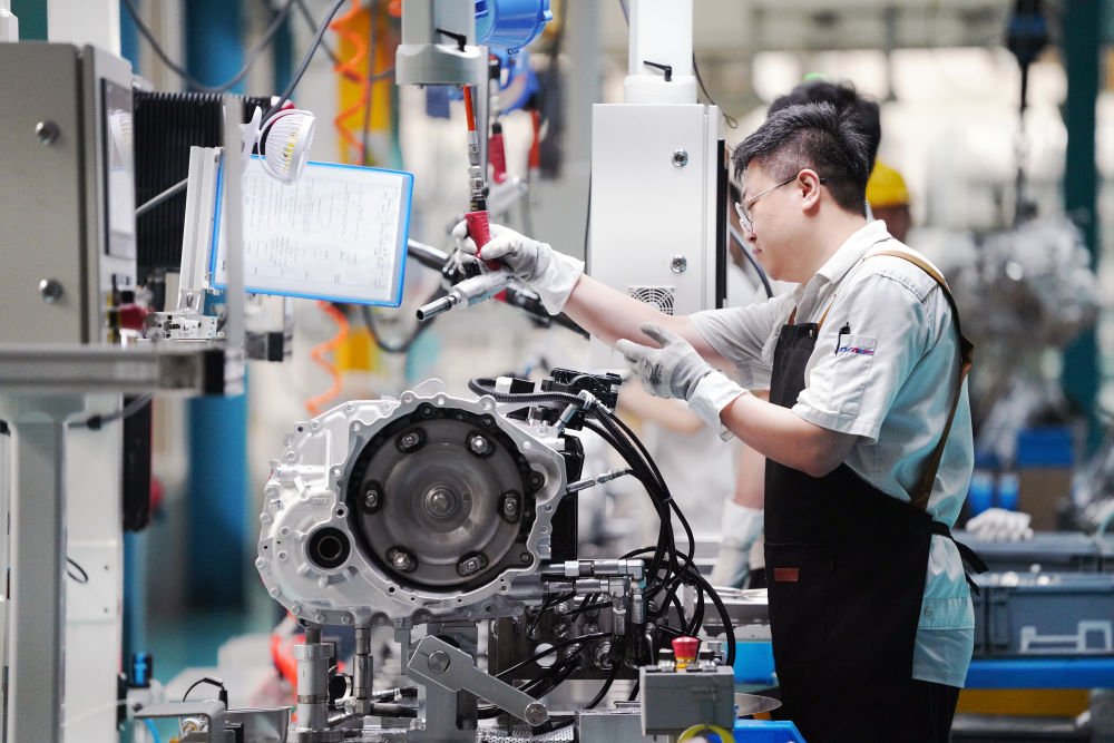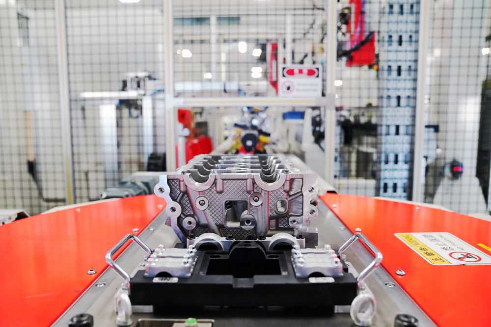 在哈尔滨东安汽车动力股份有限公司生产车间,智能生产设备对产品进行加工与组装作业(7月24日摄)。