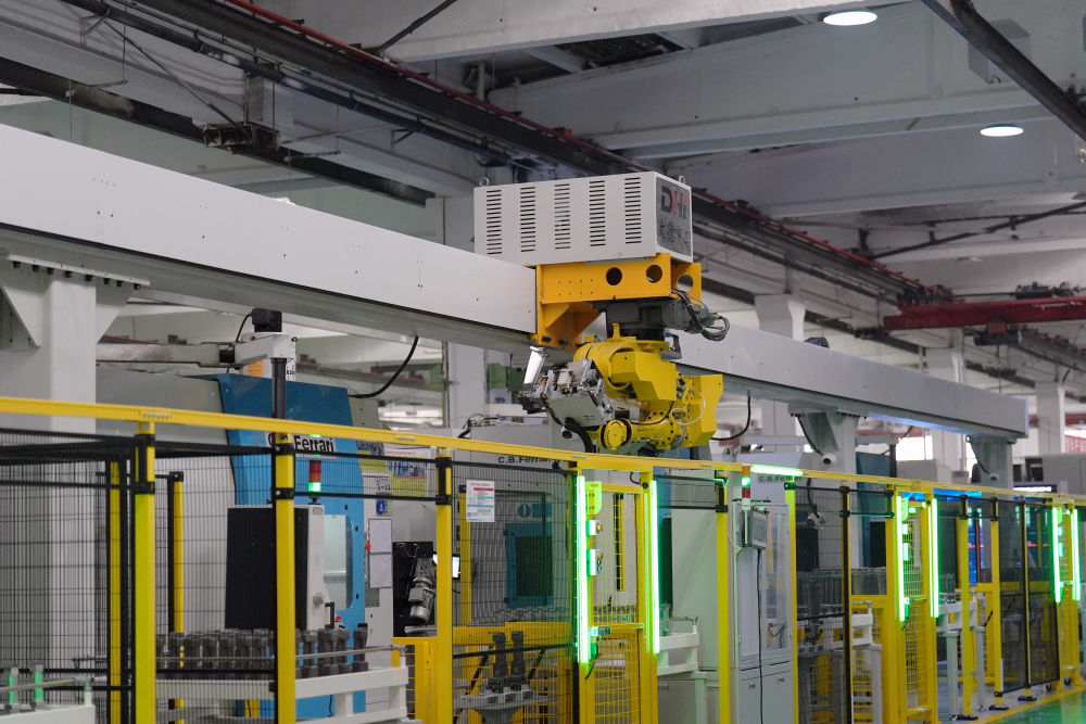 在哈尔滨汽轮机厂有限责任公司叶片分厂拍摄的中小叶片智能生产线上正在运行的机械臂(2月26日摄)。