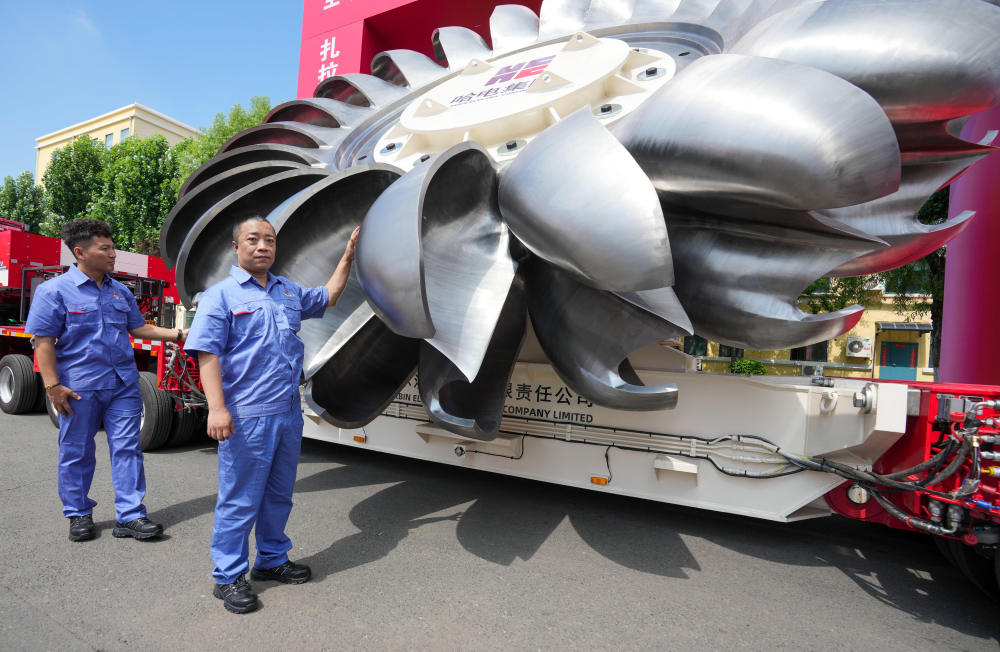 7月2日,在哈电集团哈尔滨电机厂有限责任公司厂区,一线焊接人员在介绍世界首台单机500兆瓦冲击式水轮发电机组转轮的焊接位置。该转轮自主研制的成功,标志着我国在高水头、大容量冲击式水轮机组核心装备领域实现突破。