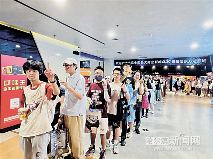 哈东万达影城观众排队入场。