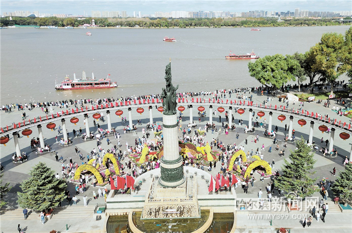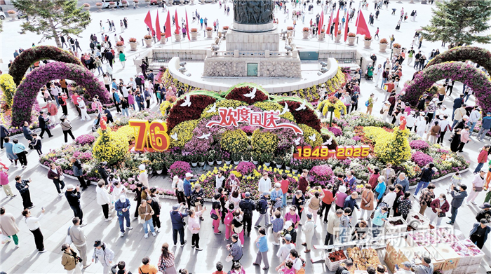 近日,道里区园林管理局在防洪纪念塔广场打造了以“欢颂国庆,共庆华诞”为主题、用花5万余株的菊花景观。该景观的中心主体花坛突出“欢度国庆”主旨,配以“76”“1949-2025”字样及暖色调立体菊花造型,象征祖国繁荣。两处菊花拱门增强互动,辅以花篮、花球、造型树来丰富视觉。主体景观两侧以凤凰造型为焦点,借其“吉祥和谐、浴火腾飞”的寓意传递美好祝愿,强化国庆庄重感与文化内涵。以菊花为主,通过各种颜色相互搭配,辅以其他花卉,营造繁花似锦效果,深化“祥瑞之鸟贺华诞”意象,传递欢乐、生机与对未来的期许。很多市民已迫不及待围着景观拍照欣赏了。