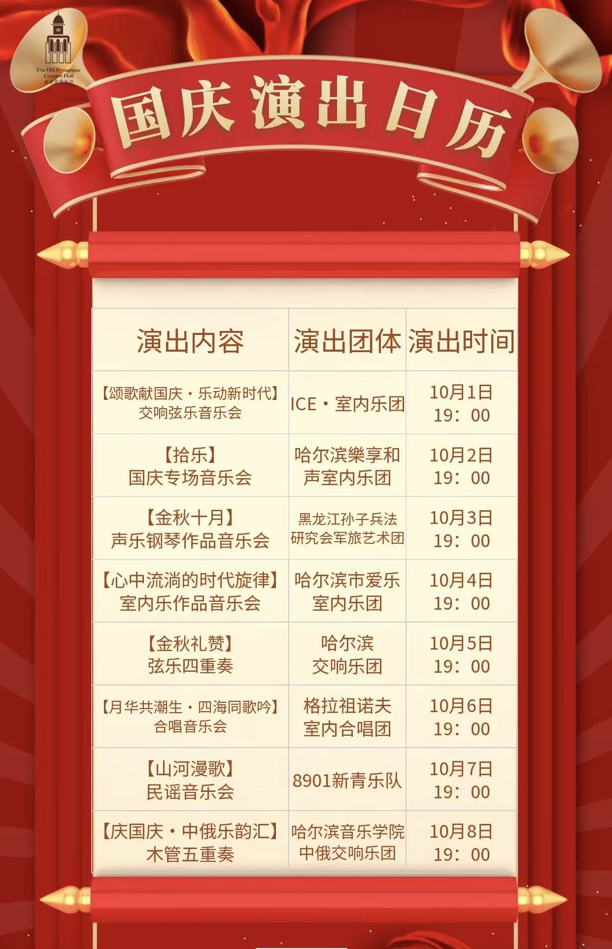 记者从哈尔滨老会堂音乐厅获悉,国节期间10月1日—8日,哈尔滨老会堂音乐厅“乐声不断”,每天都有精彩演出,为市民、游客假期生活带来丰富的视听享受。