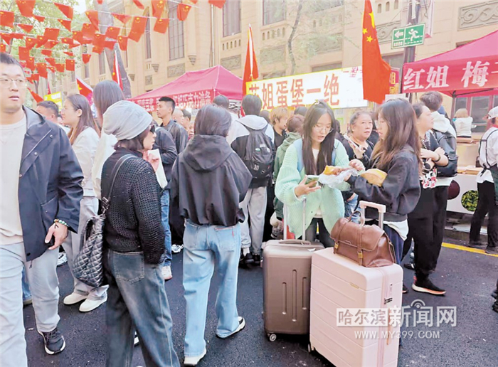当第一缕阳光越过屋顶,早市的烟火气与节日的喜庆气息相互交融。早市里,没人在意队伍多长,也没人急着赶路,大家捧着热乎的吃食,或在市场里慢慢品尝,或举着相机记录摊主递来食物时的笑脸。这里没有精致的摆盘,却用实在的美味和热情,让游客把哈尔滨的“双节”记忆。