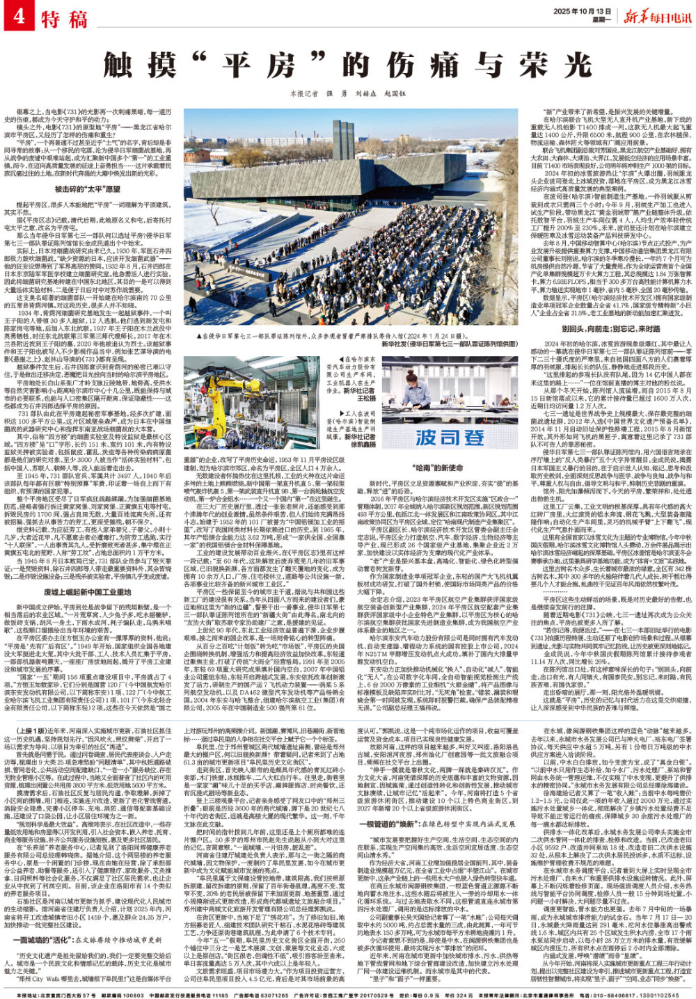 “平房”,一个再普通不过甚至近乎“土气”的名字,背后却是非同寻常的故事:从一个移民的屯落,沦为侵华日军细菌战基地,再从战争的废墟中艰难站起,成为汇聚新中国多个“第一”的工业重镇,而今,在迈向高质量发展的征途上奋勇担当……这片承载着民族沉痛过往的土地,在新时代奔涌的大潮中焕发出新的光彩。