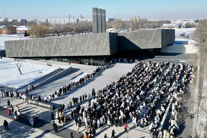 在侵华日军第七三一部队罪证陈列馆外,众多参观者冒着严寒排队等待入馆(2024年1月24日摄)。新华社发(侵华日军第七三一部队罪证陈列馆供图)