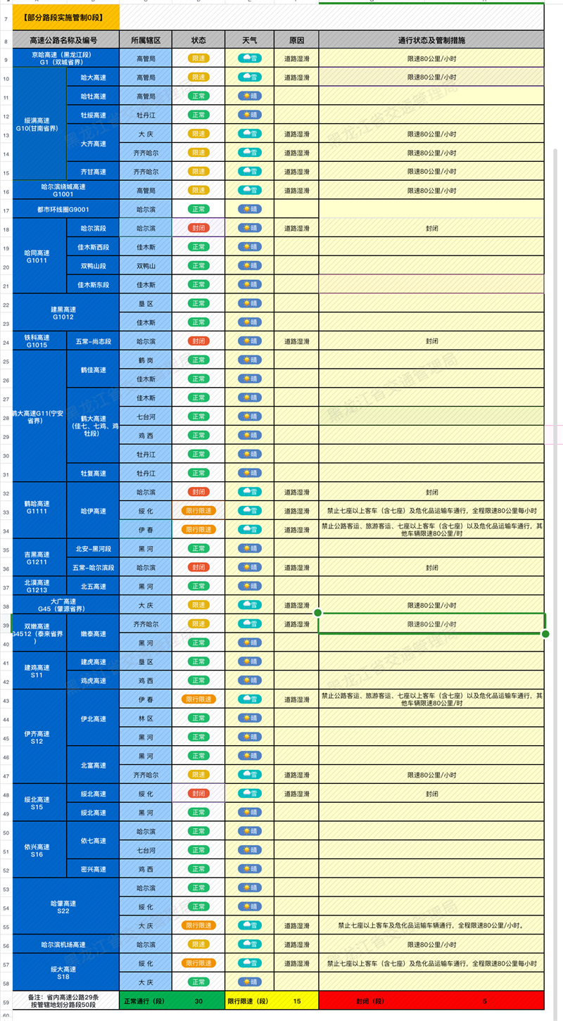 10月17日8时30分,记者从省高速交警部门获悉,受此轮降雨降雪影响,道路湿滑,可见度低,目前哈同高速哈尔滨段、铁科高速等5段高速公路封闭。机场高速、京哈高速等15条高速限速限行。