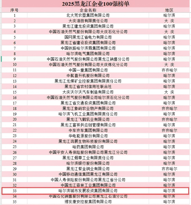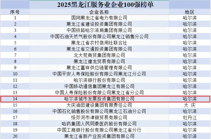 日前,省企业联合会、省社会科学院、黑龙江日报报业集团联合发布2025黑龙江企业100强系列榜单,哈尔滨城市发展投资集团有限公司(以下简称“哈尔滨城发投集团”)以其卓越的综合实力和显著的社会贡献,入选两项榜单:在黑龙江企业100强中排名第33位,在黑龙江省服务业企业100强中位列第14位。