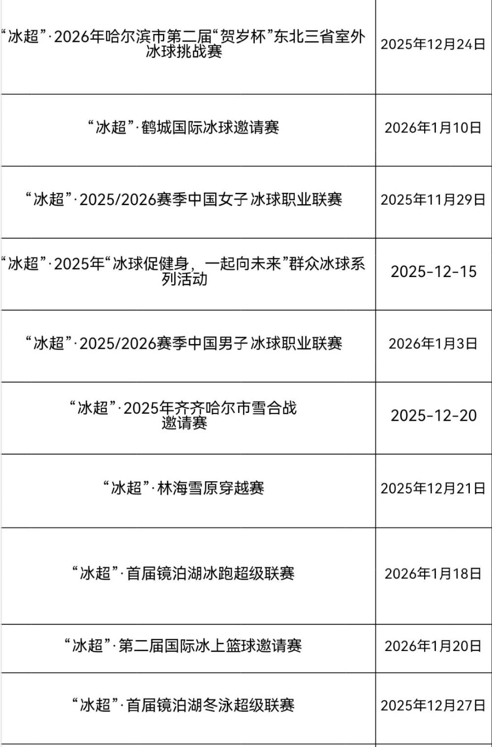 首届“冰超”择优选取了100项赛事