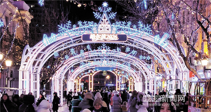 5日晚,中央大街南门主题灯景——“冰雪之冠”璀璨登场,“冰雪之冠”主题灯景汲取老街建筑神韵,以气势恢宏的冰雪长廊串联起街道的浪漫脉络,将冰雪的纯净质感与建筑的复古韵味相融合,还原了冰雪之城的凛冽美感,让游客充分感受童话幻境般的浪漫氛围。
