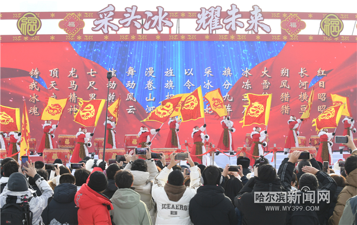 采头冰,是这场盛典最神圣的篇章。伴随着震天的鼓声与悠扬的采冰号子,身着传统服饰的采冰汉子们齐饮出征酒,手持冰镩,郑重地凿向冰面。飞溅的冰花在阳光下闪烁,象征着幸运与福气的“头冰”被红布包裹着隆重抬出,仿佛是松花江馈赠给这座城市的诗意律动。哈尔滨人将冰雪化为文化,将江水塑为艺术。昔日,采冰是生存的智慧;如今,采冰已成为一种民俗庆典,是文旅融合的盛宴。从古老的文化元素到现代的冰雕艺术,从传统的江水煮饺子到时尚的冰雪文创,哈尔滨在传承中创新,让古老的采冰文化焕发出新的生机。