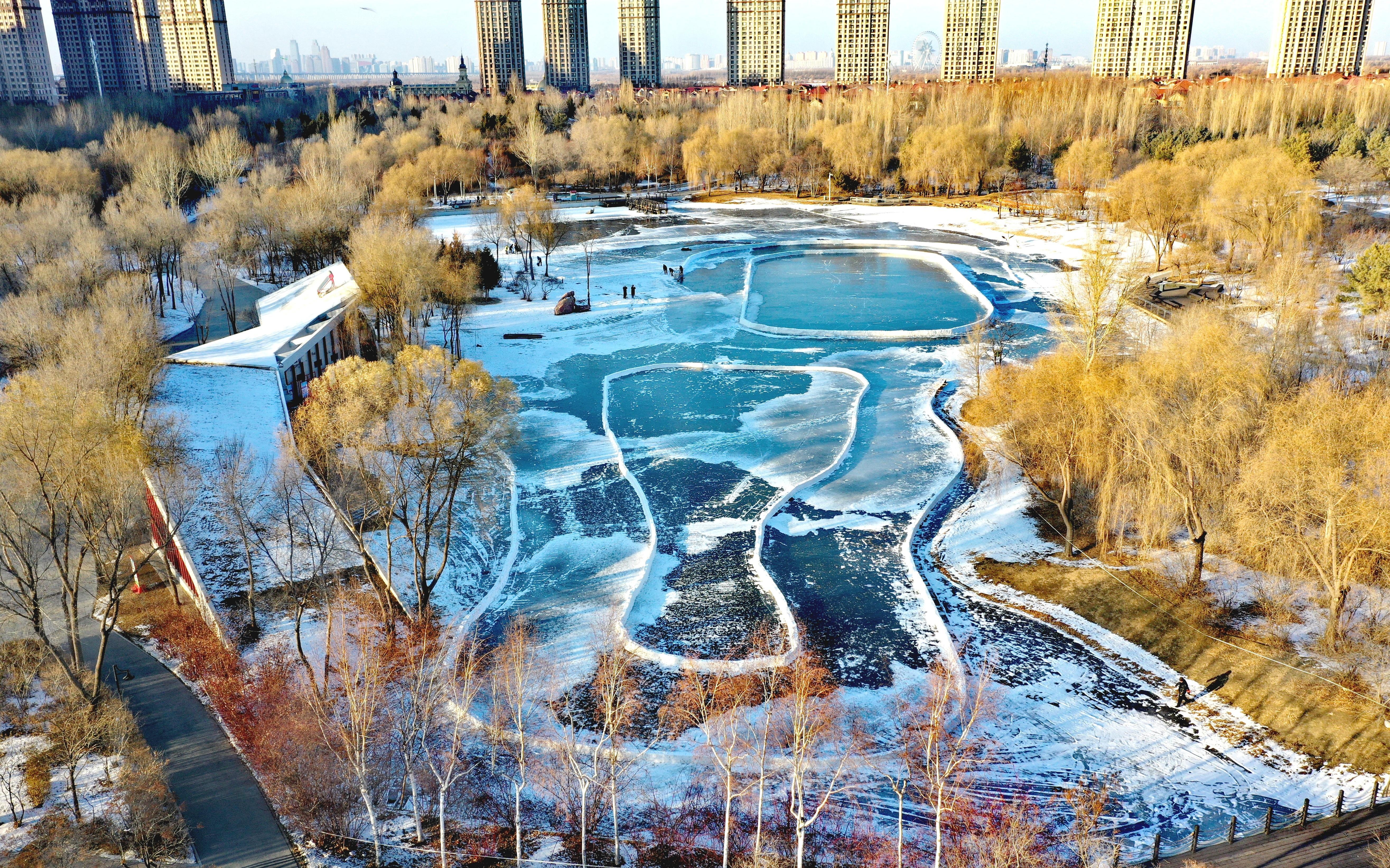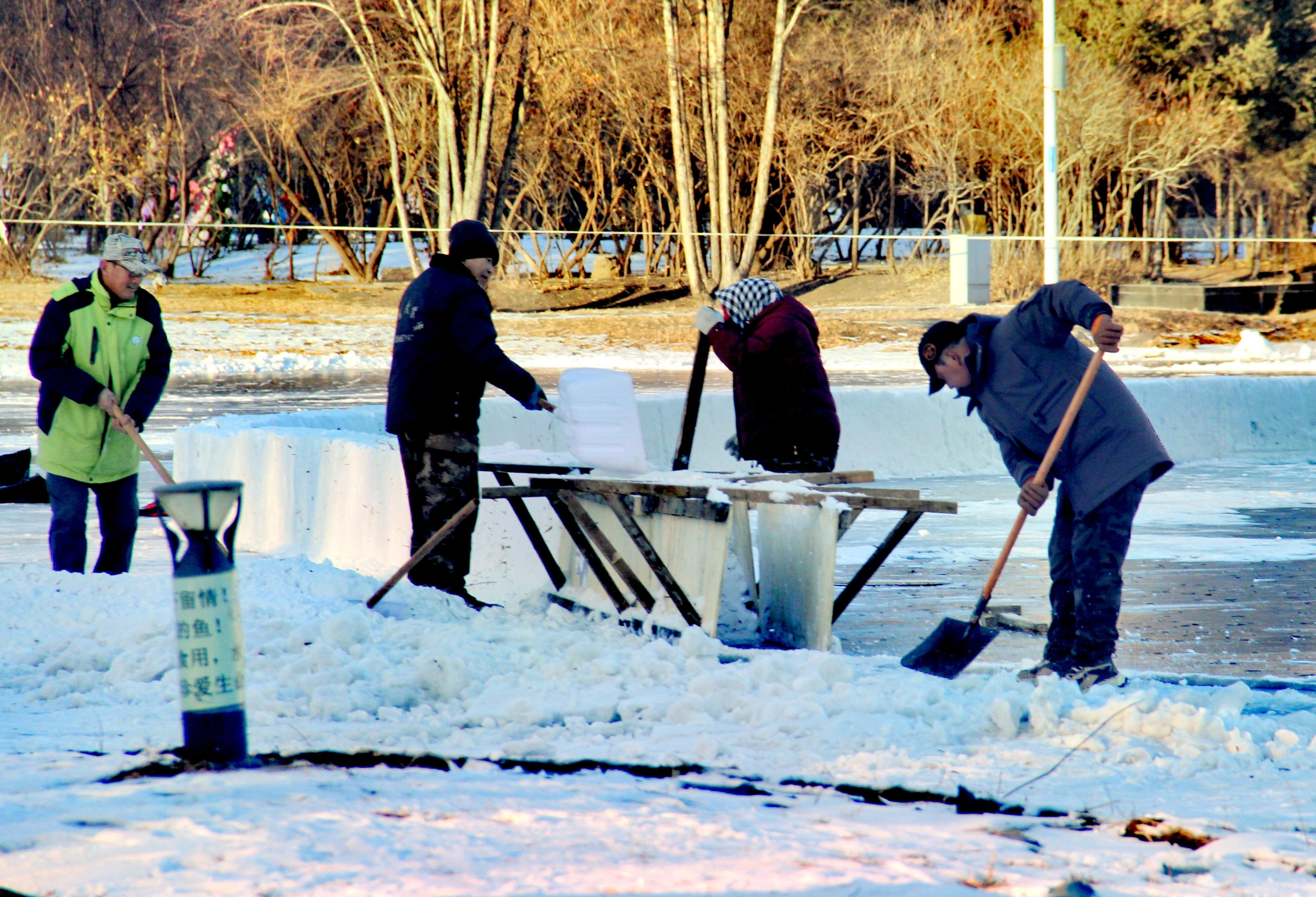 公园北侧近万平方米的大湖上,工人们正在进行公益冰场的建设。工人将湖面的积雪收集起来制成半米多高的雪墙,用来将儿童初学区、快速滑道等区域分隔开,之后还将进行平整冰面、浇冰等工作。