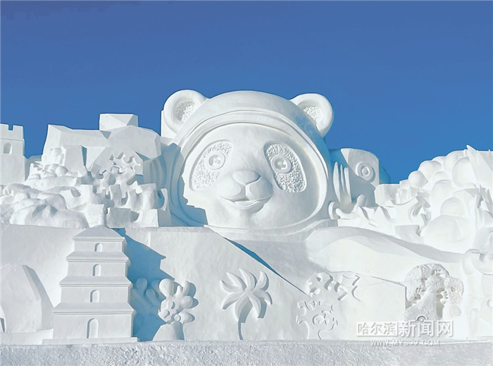 该主塑用雪量达3万立方米,整体长103米、宽20米、高33米,核心造型为一只身着宇航服的大熊猫。国宝的憨萌与航天的科技感完美融合,彰显出中国文化底色,述说探索星辰大海的雄心。主塑微微抬起的手构成极具力量的“点赞”姿态,承载着对祖国的自豪之情。