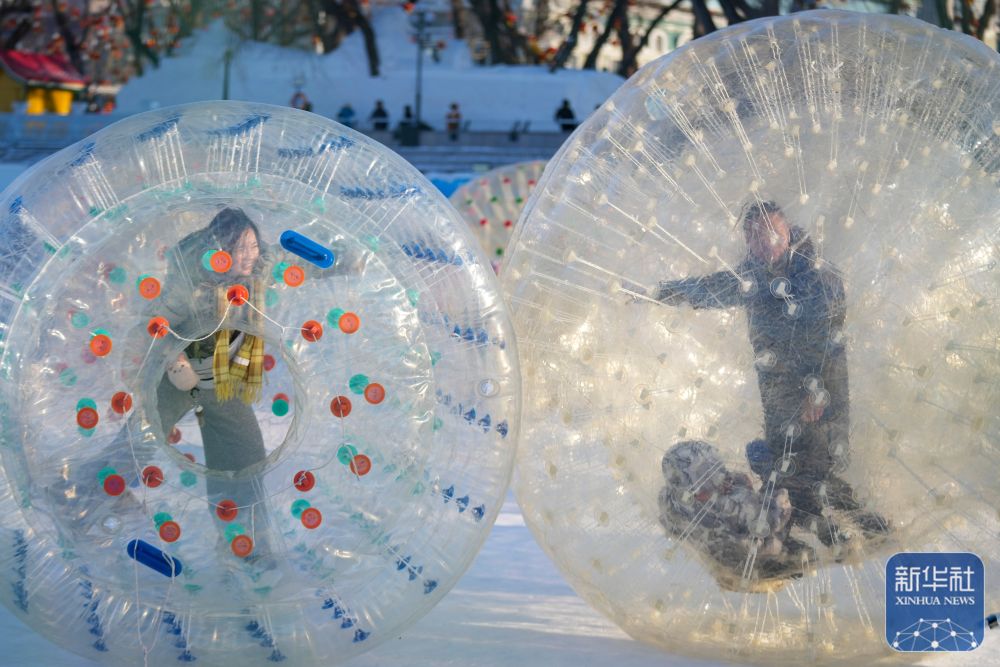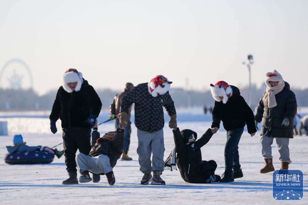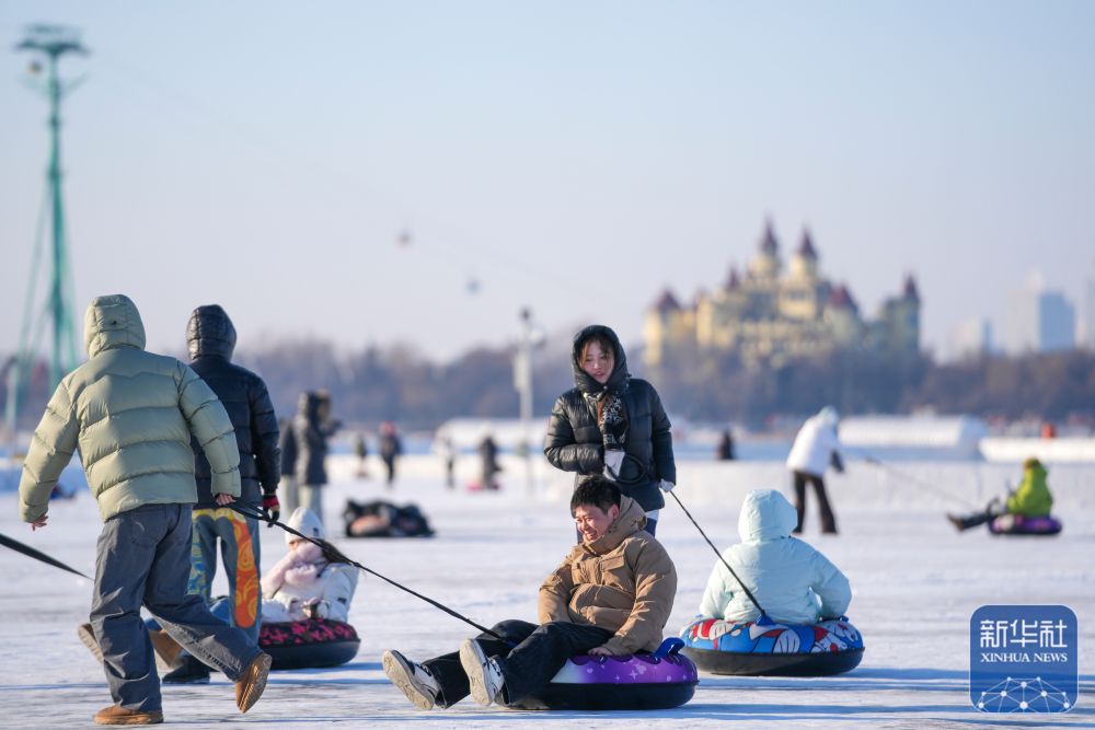 ↑ 1月10日,游客在松花江哈尔滨段江面体验冰雪娱乐项目。新华社记者 王建威 摄