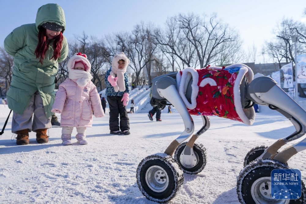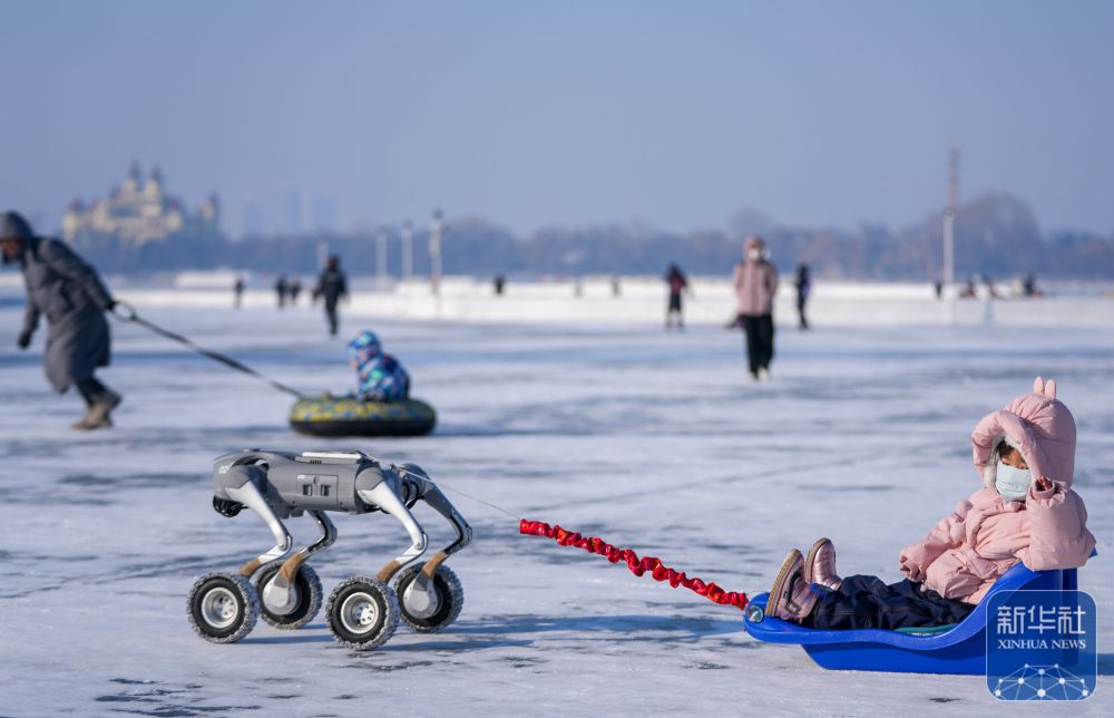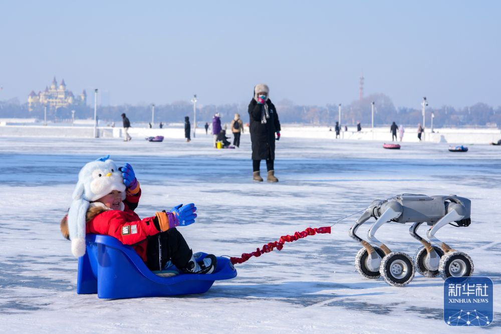 ↑ 1月11日,小朋友在松花江哈尔滨段江面上体验机器狗拉爬犁。新华社记者 王建威 摄