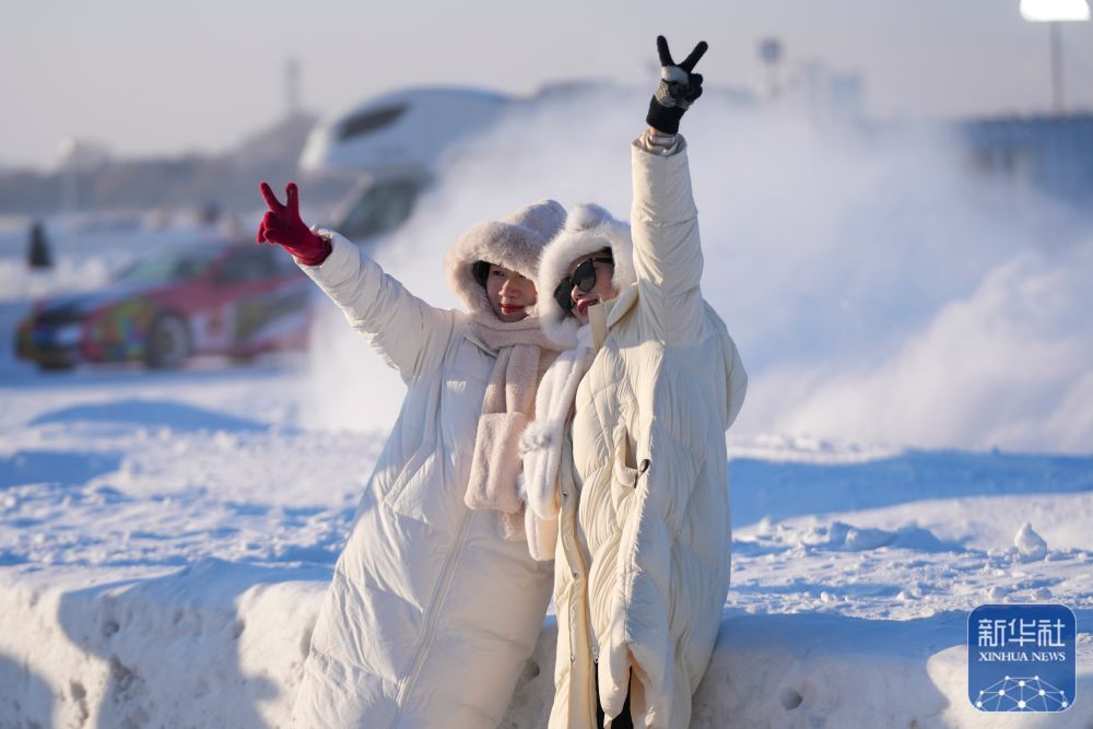 ↑ 1月10日,游客在松花江哈尔滨段江面上跳舞。新华社记者 王建威 摄
