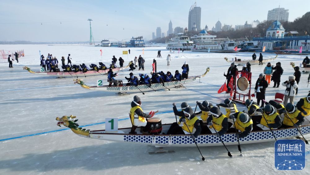 ↑ 1月9日,人们在松花江哈尔滨段江面上进行冰上龙舟比赛(无人机照片)。新华社发(刘洋摄)